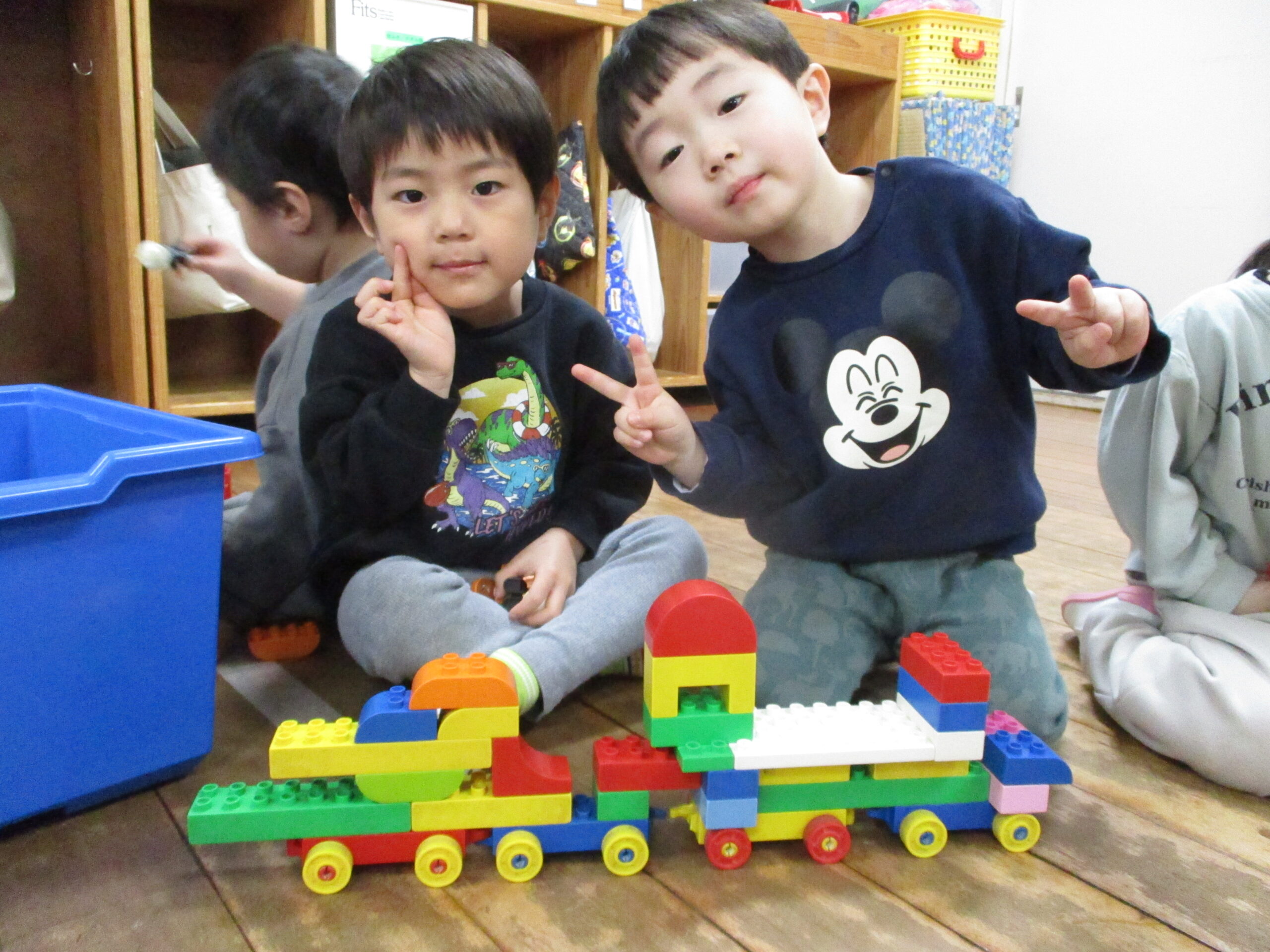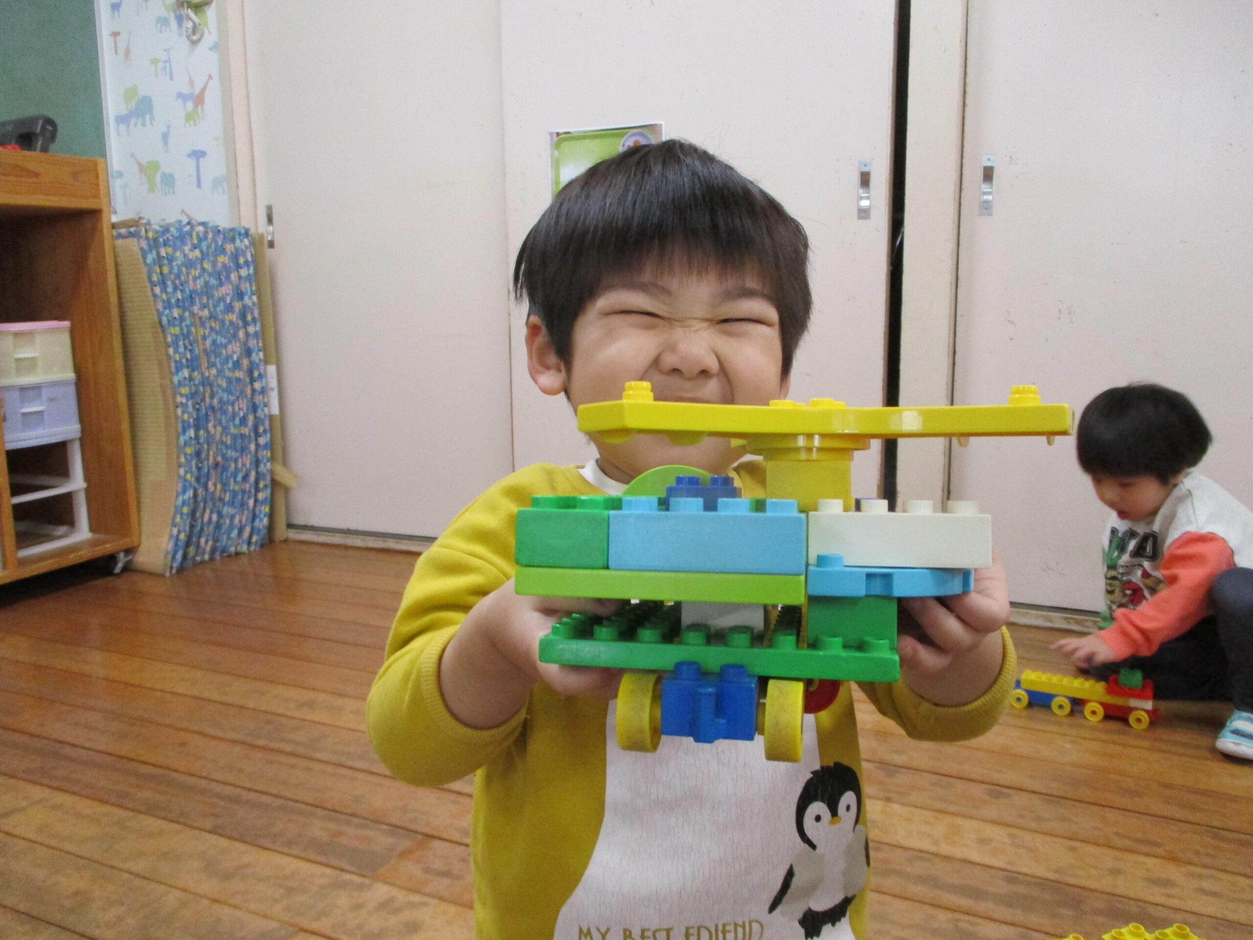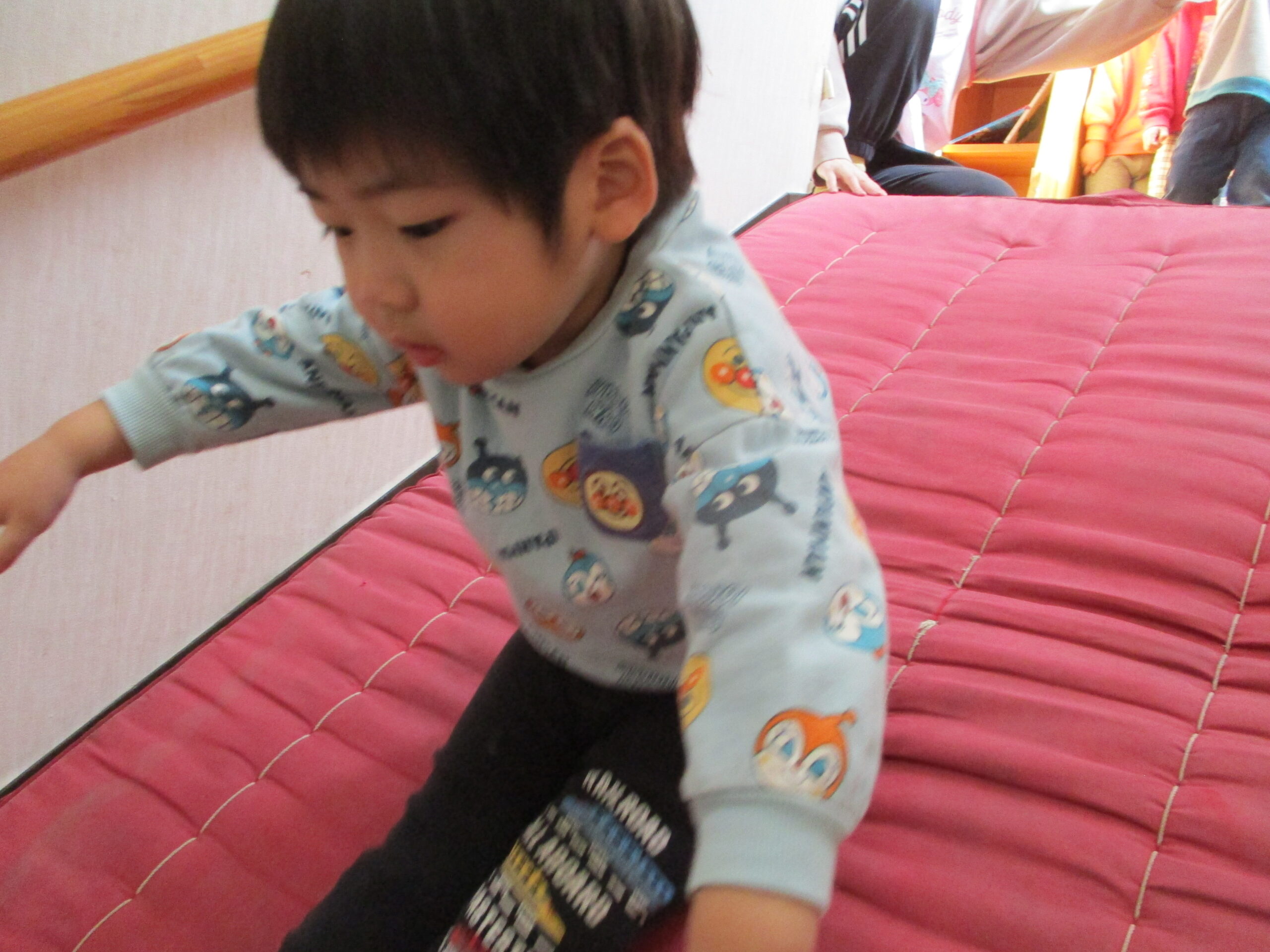 肩掛けバッグとお着替えバックと持ち物も変わり、毎日の日課のシール帳の練習にも取り組んでいます!覚えることが多く、進級への不安等も見られると思われますが、たくさん褒めて、ギューと抱きしめていただきたいです🥰
