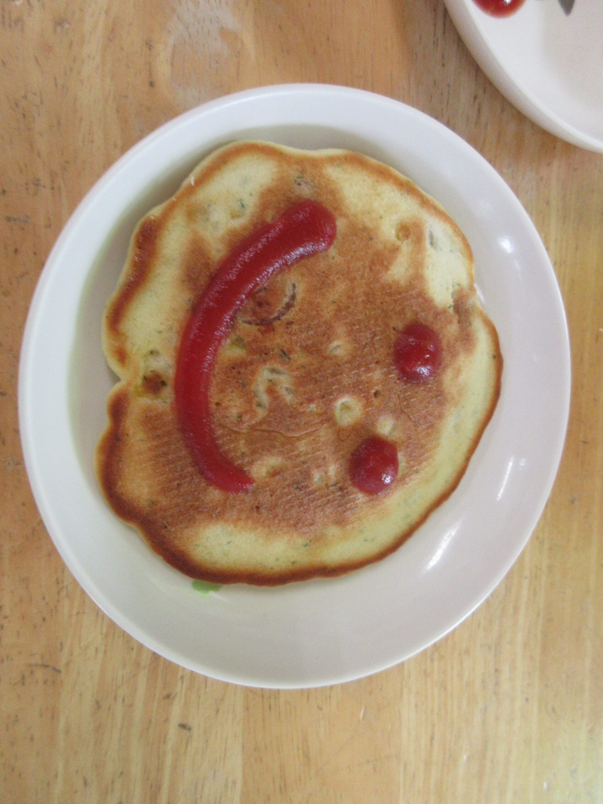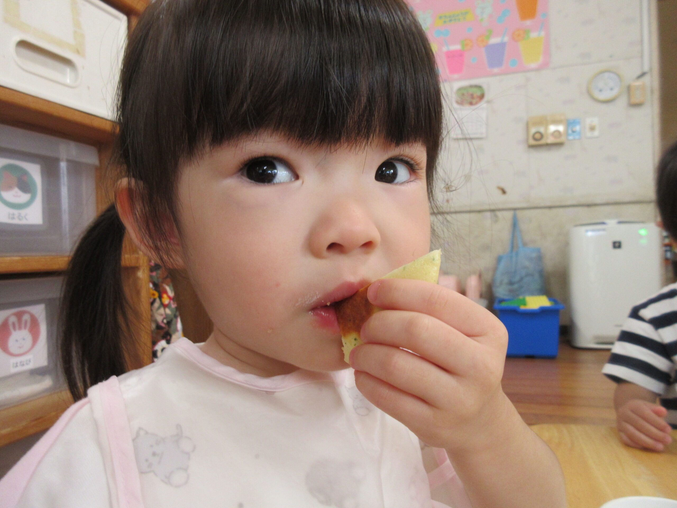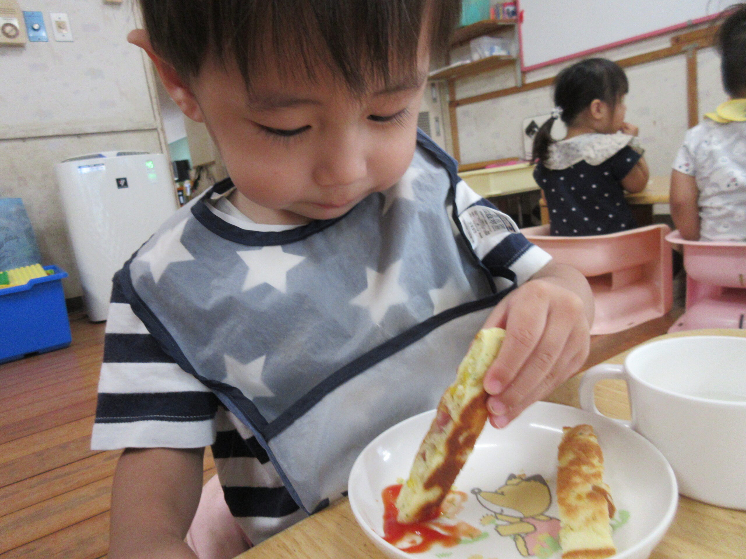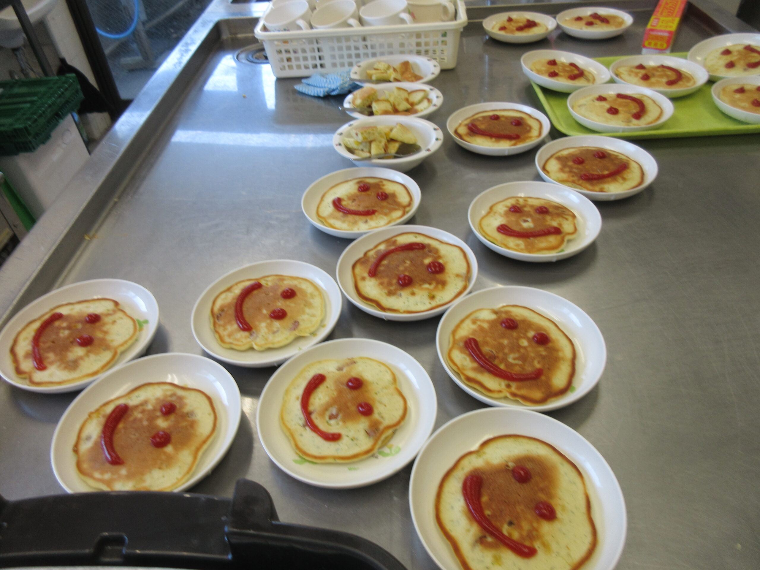 2025.10.03 アメリカンホットケーキ🍳 今日のおやつはアメリカンホットケーキ! 丁寧に焼き目がつけられたおいしそうなホットケーキ☆ ケチャップで一枚一枚かわいらしい「かお」が描かれています。 小さいクラスのお友だちは食べやすいスティック状に。ケチャップをディップしていただきました💛