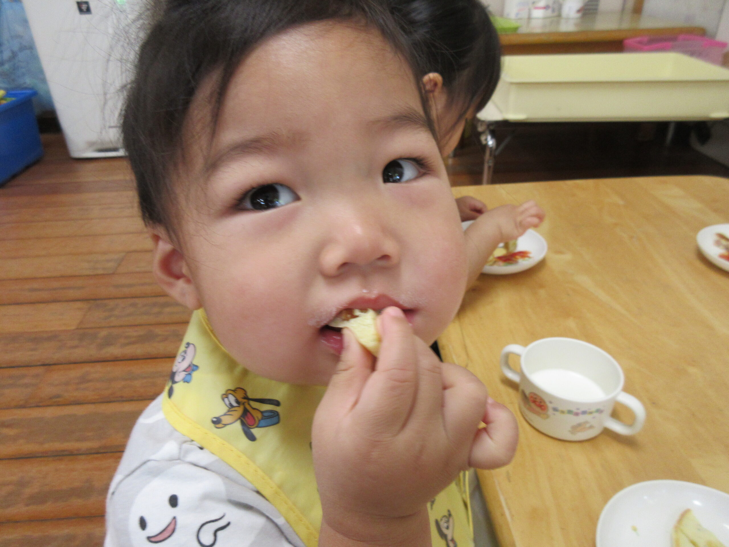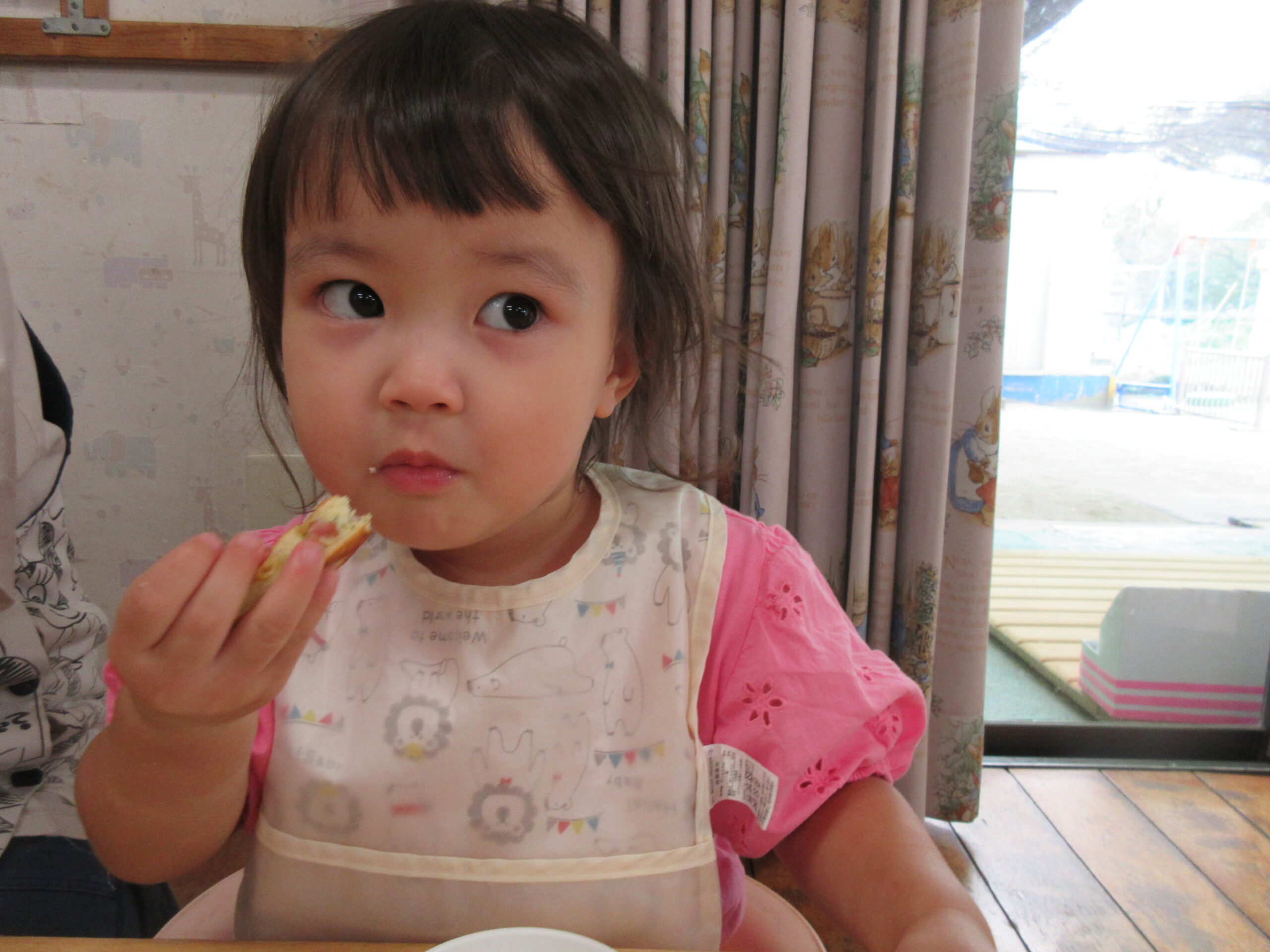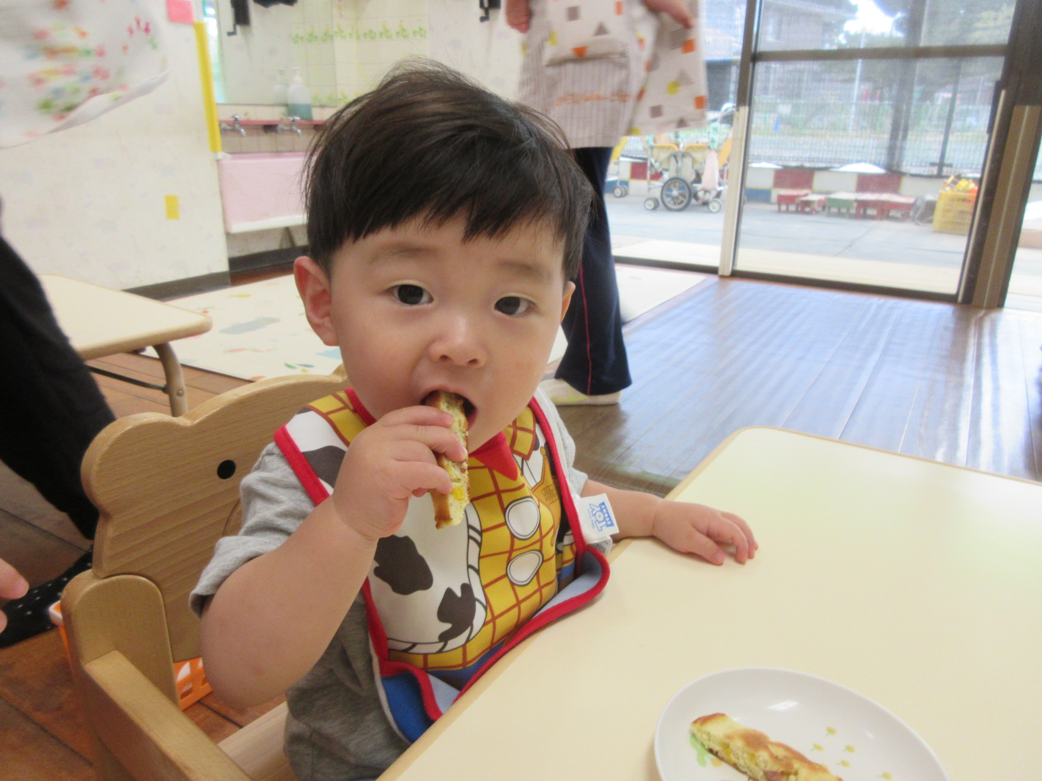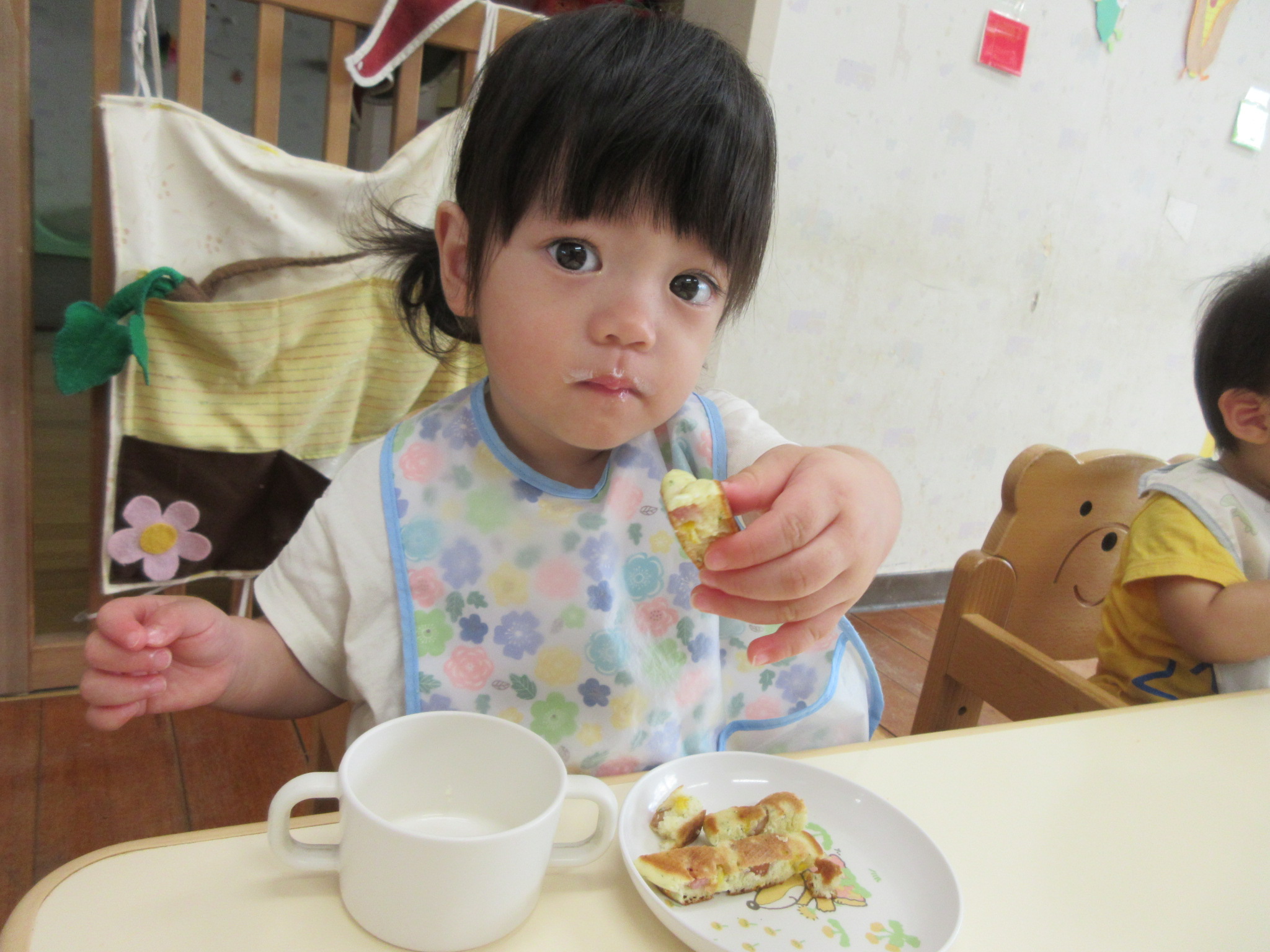 2025.10.03 アメリカンホットケーキ🍳 今日のおやつはアメリカンホットケーキ! 丁寧に焼き目がつけられたおいしそうなホットケーキ☆ ケチャップで一枚一枚かわいらしい「かお」が描かれています。 小さいクラスのお友だちは食べやすいスティック状に。ケチャップをディップしていただきました💛