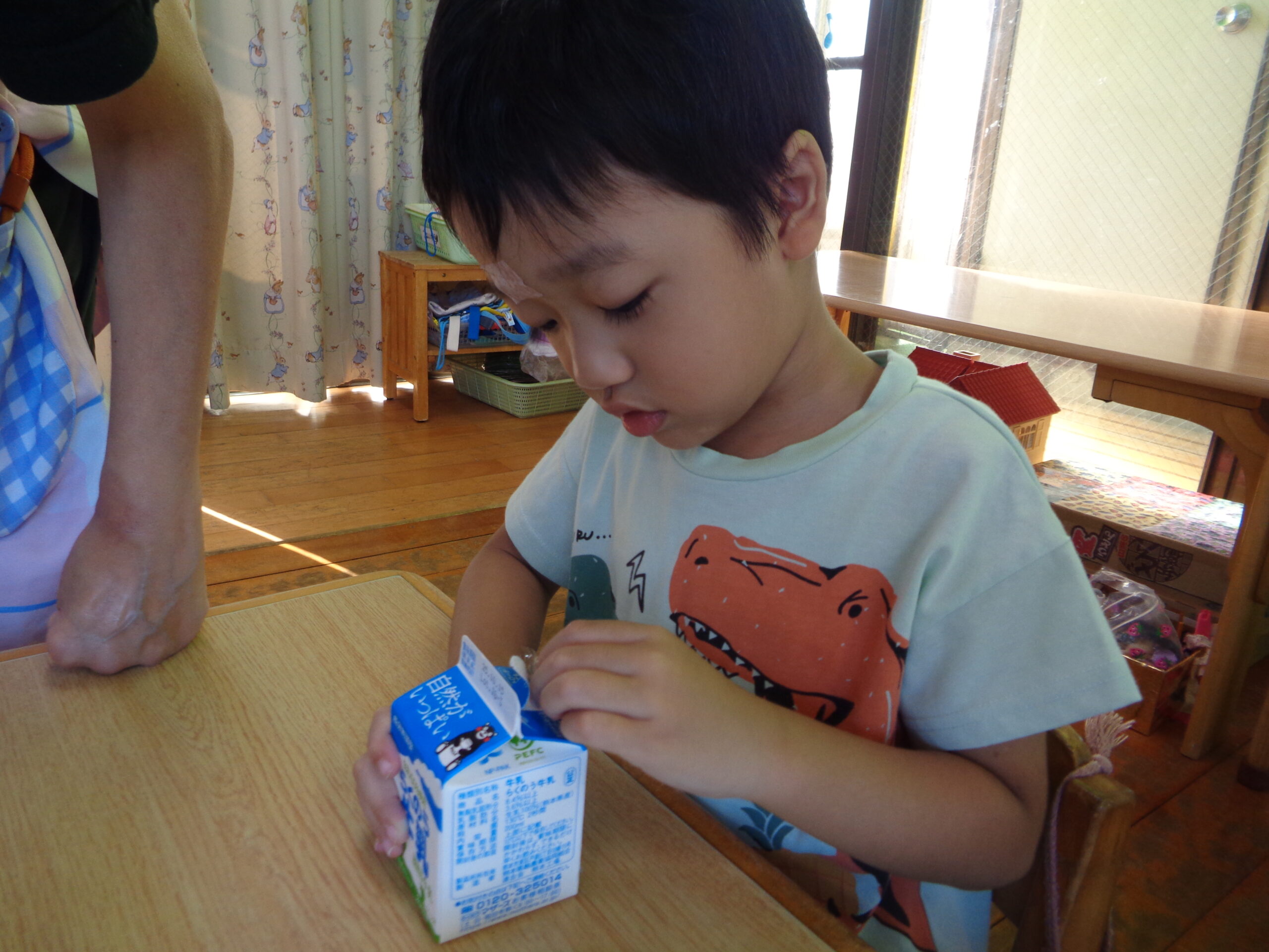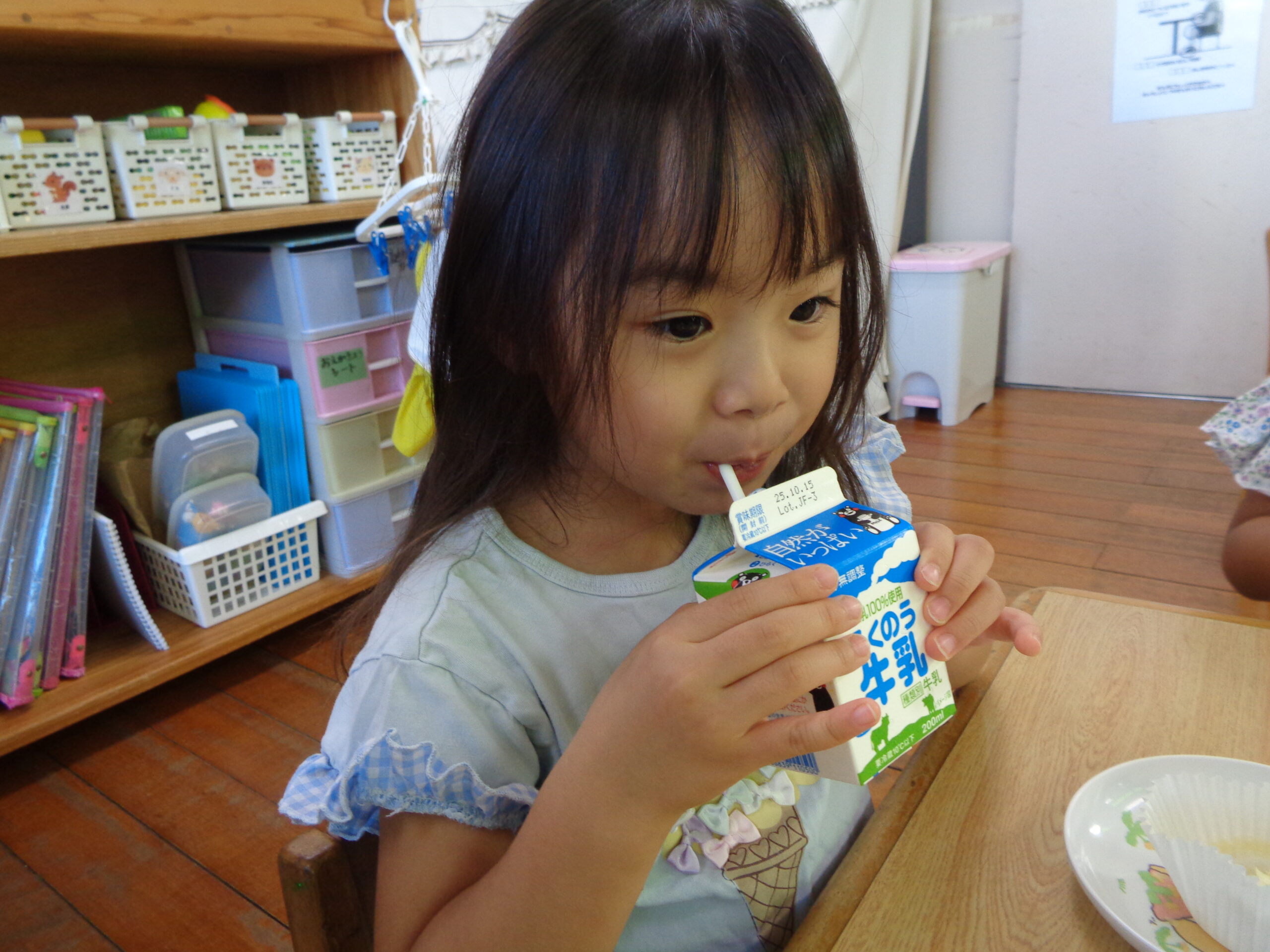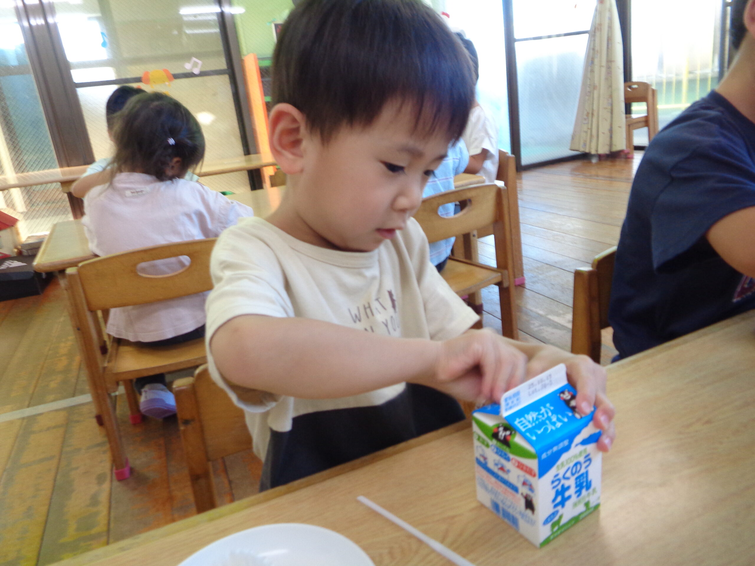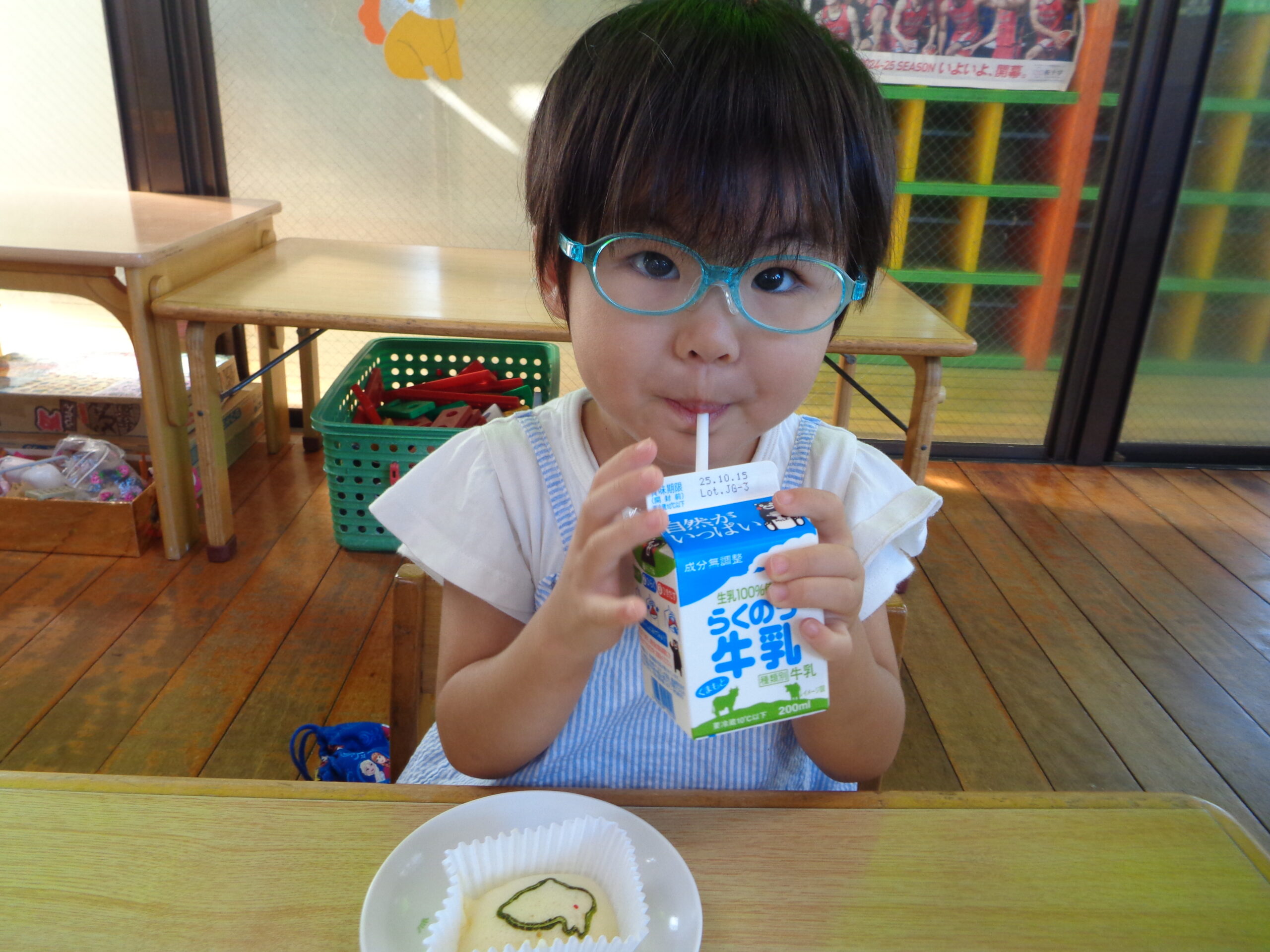2025.10.23 パックデビュー🥛 進級に向け、牛乳パックデビューをしたくま組さん!「えーきりんさんみたい!」とわくわくしていました。ストローを出すのにも最初は一苦労…指先を使って頑張って取り出していました!パックでの飲む牛乳はどこかお兄さん・お姉さんになった特別な味でした💚 お・ま・け♡ ハロウィン製作でガイコツを作りました!個性豊かな作品が完成🎃