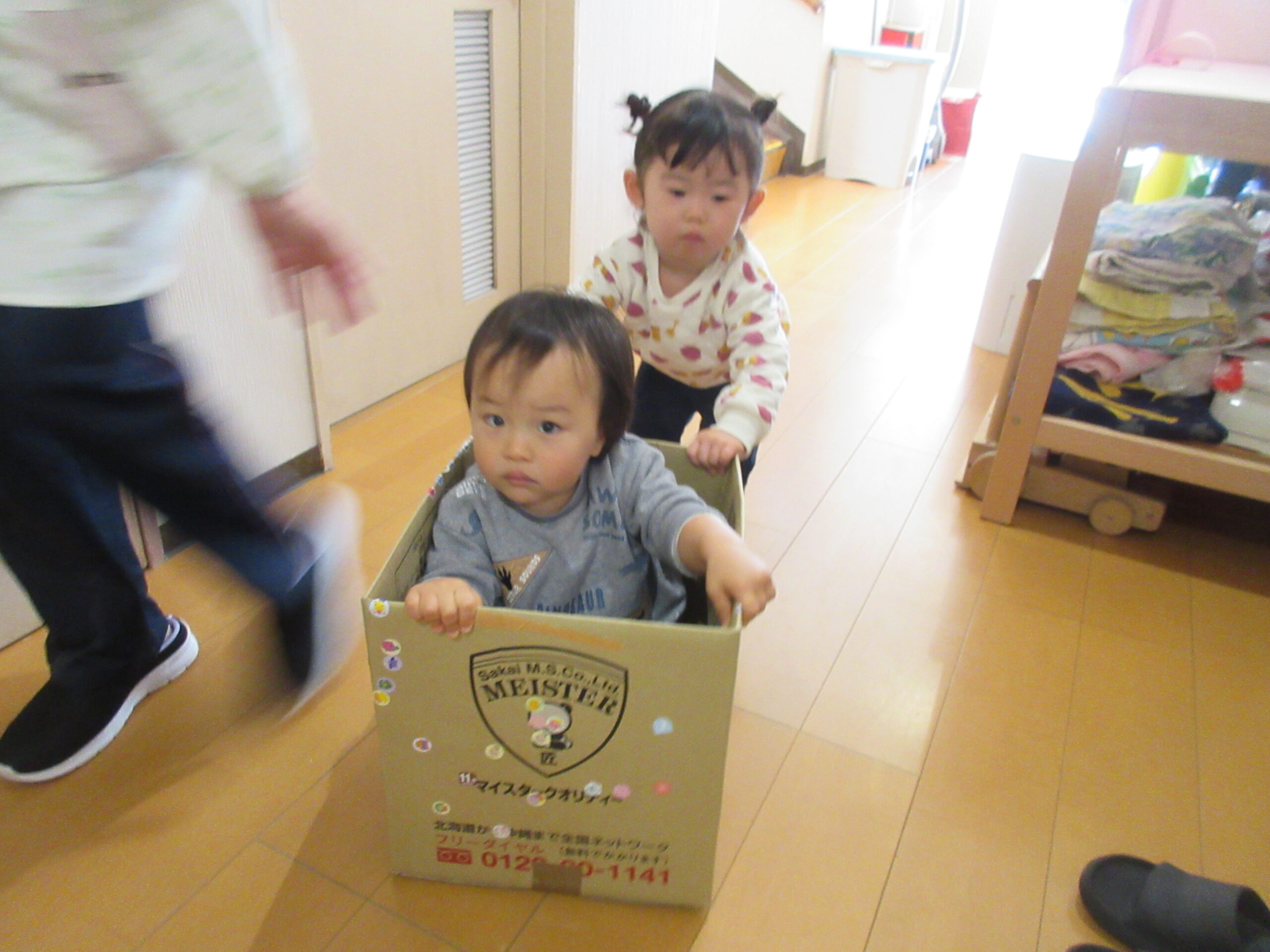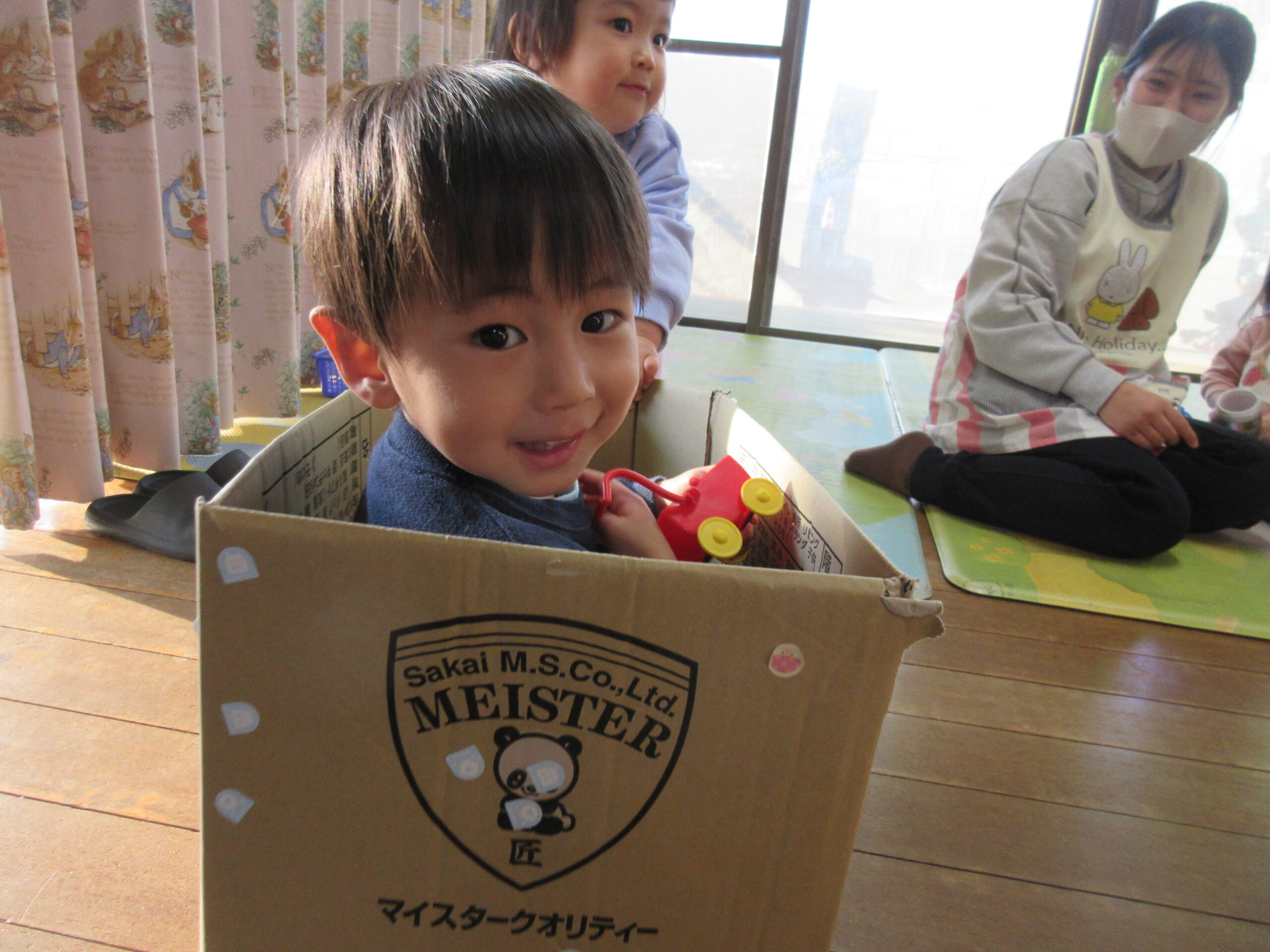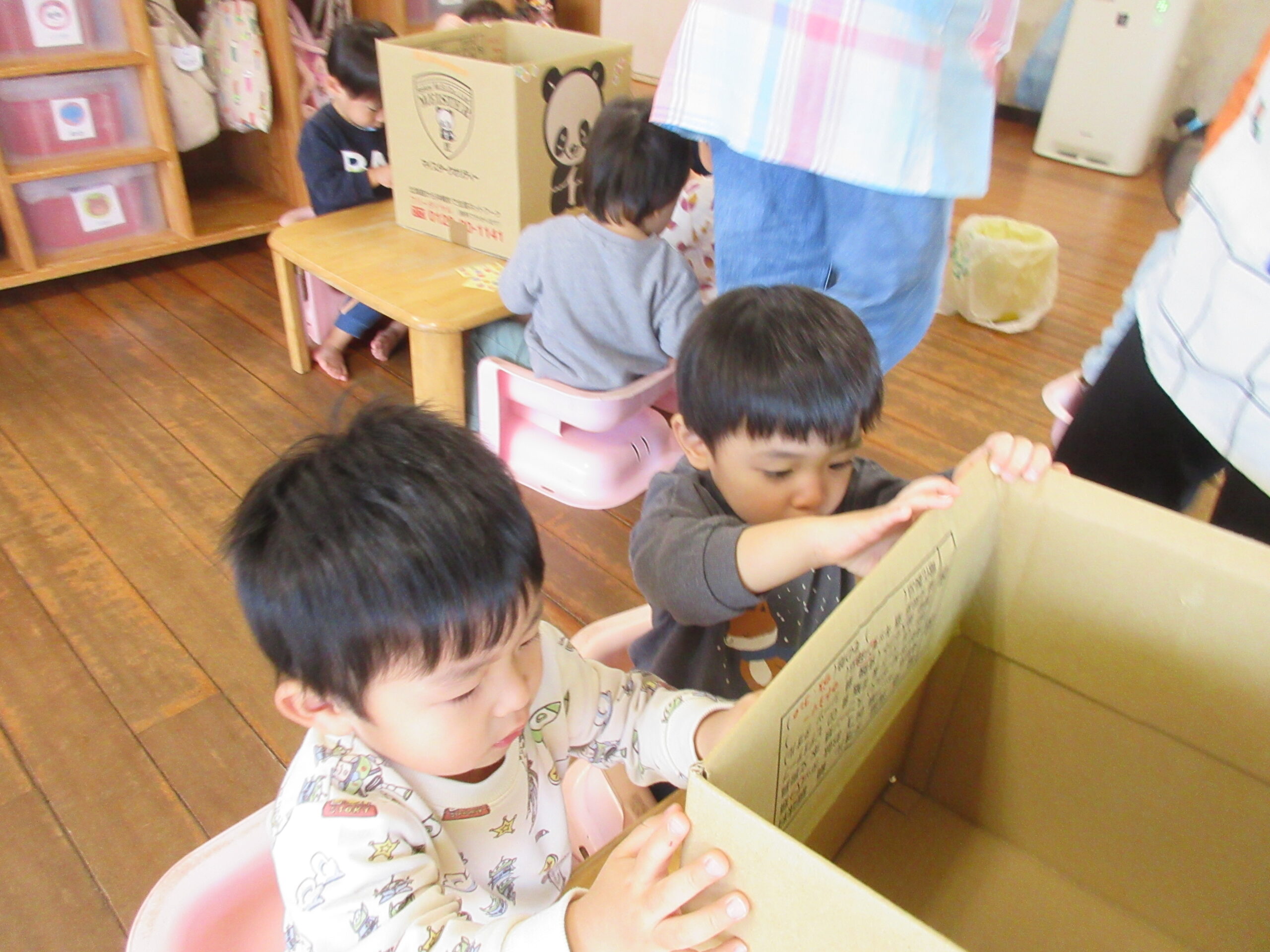 段ボールに自分達でシールを使って飾り付けましたよ🎁