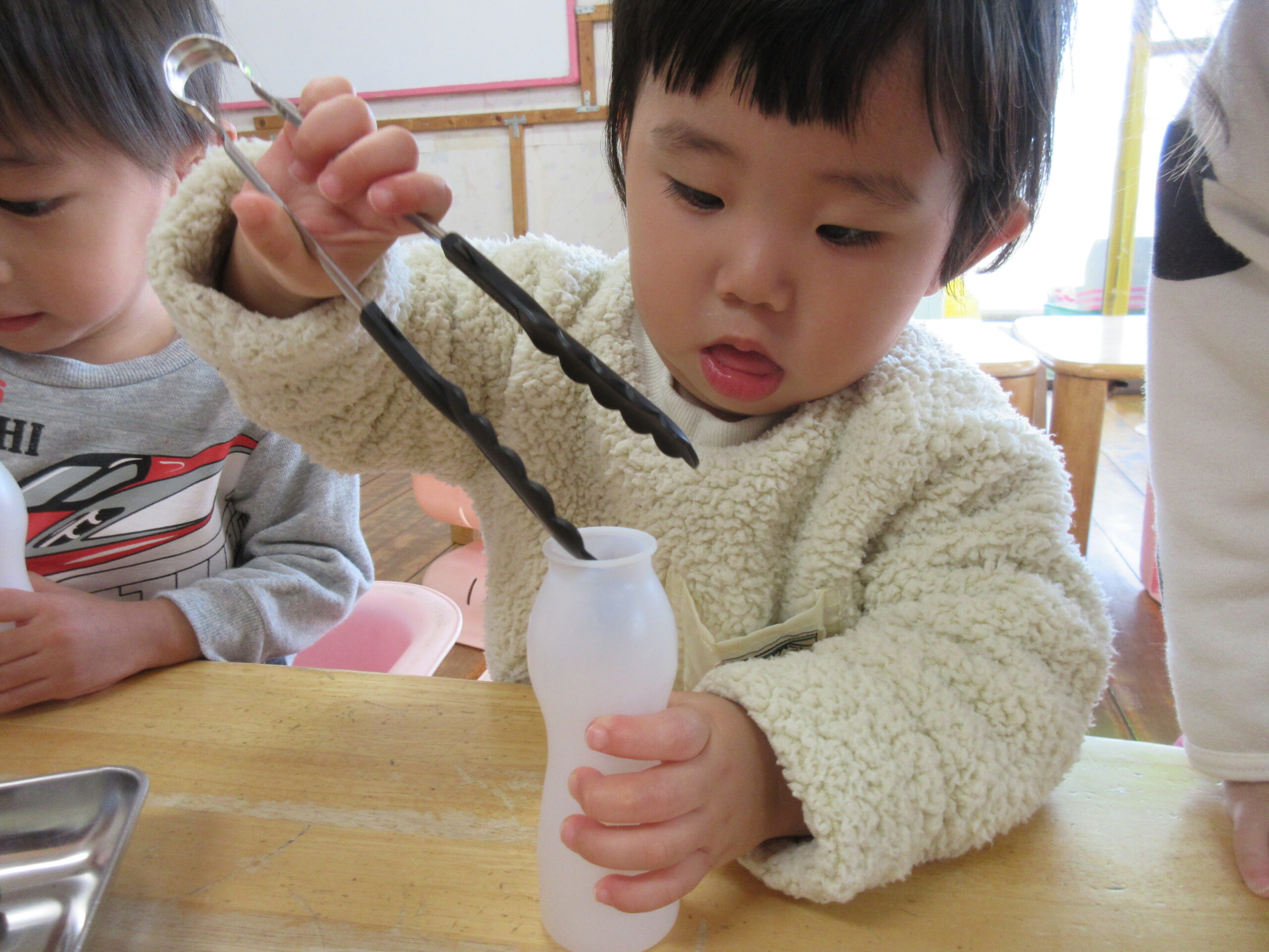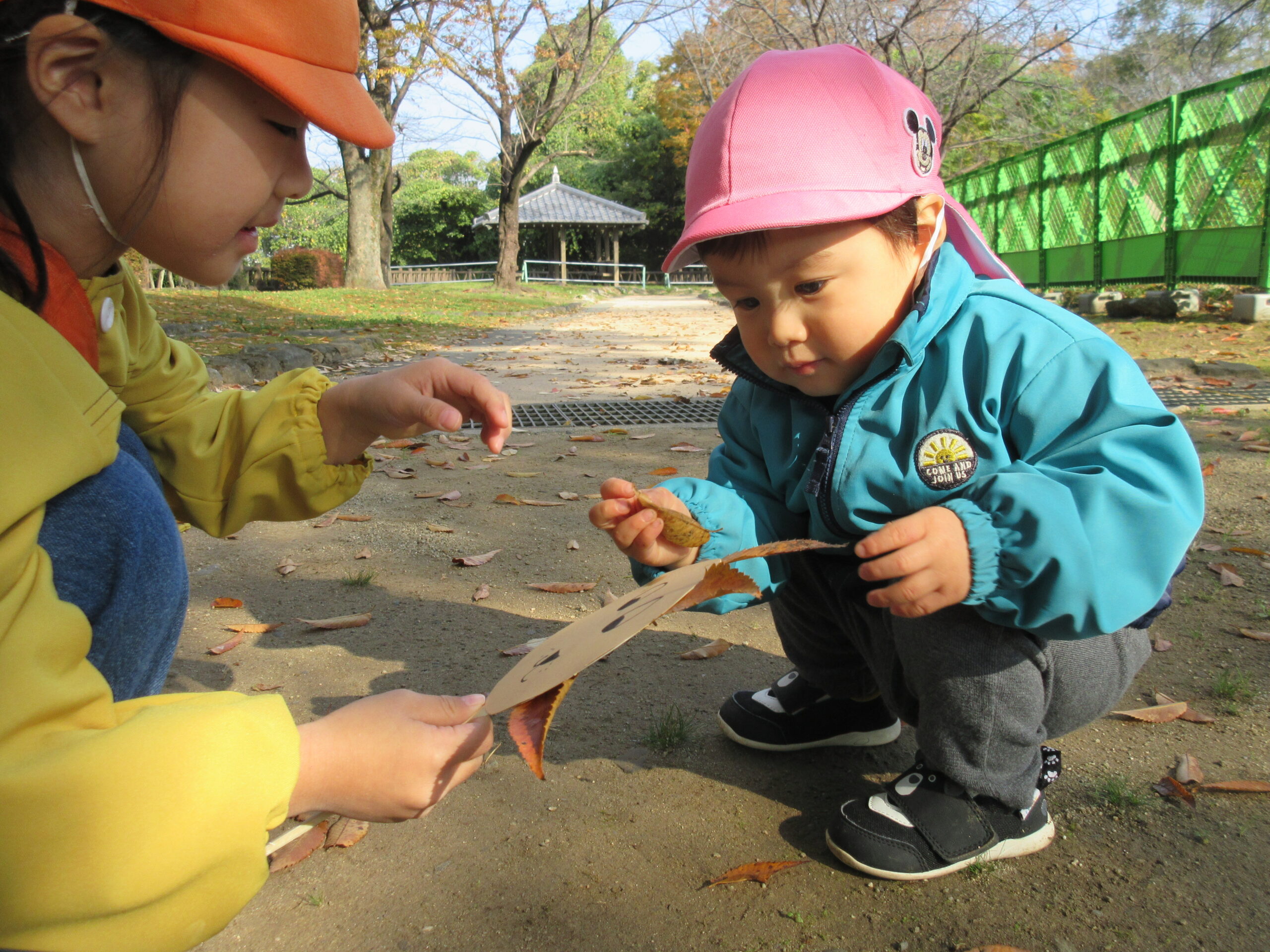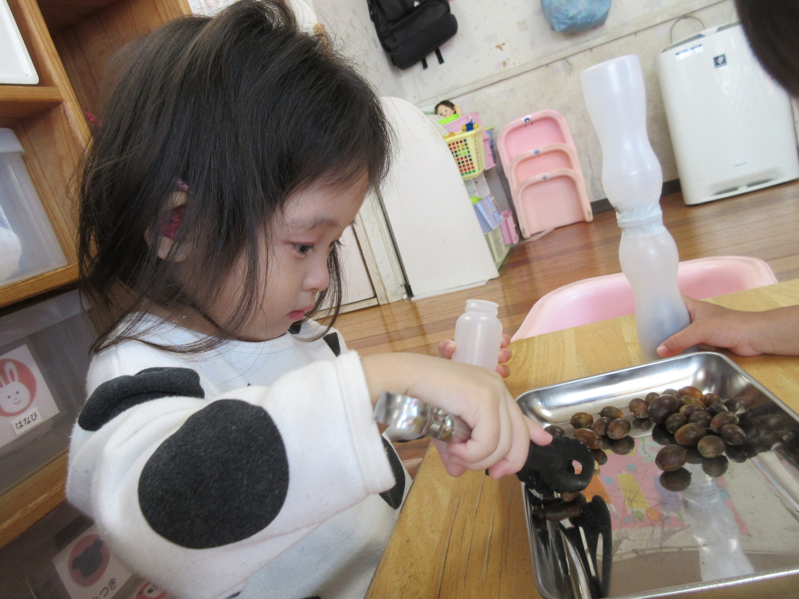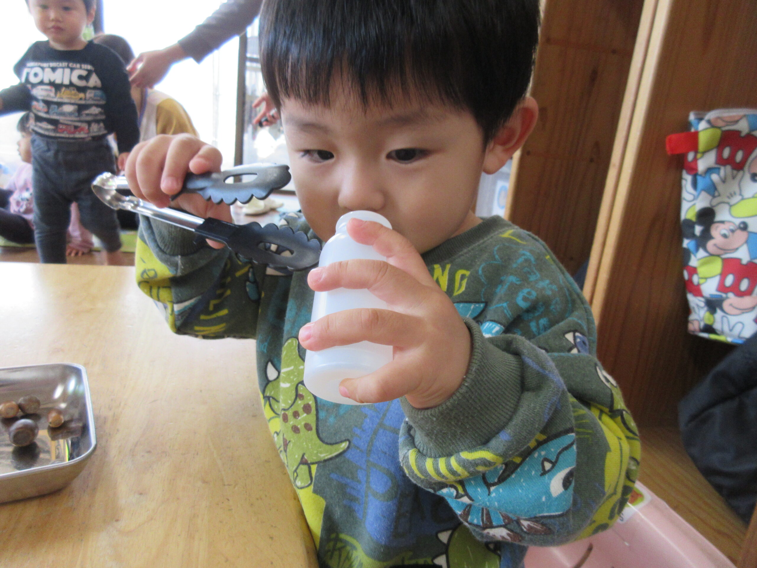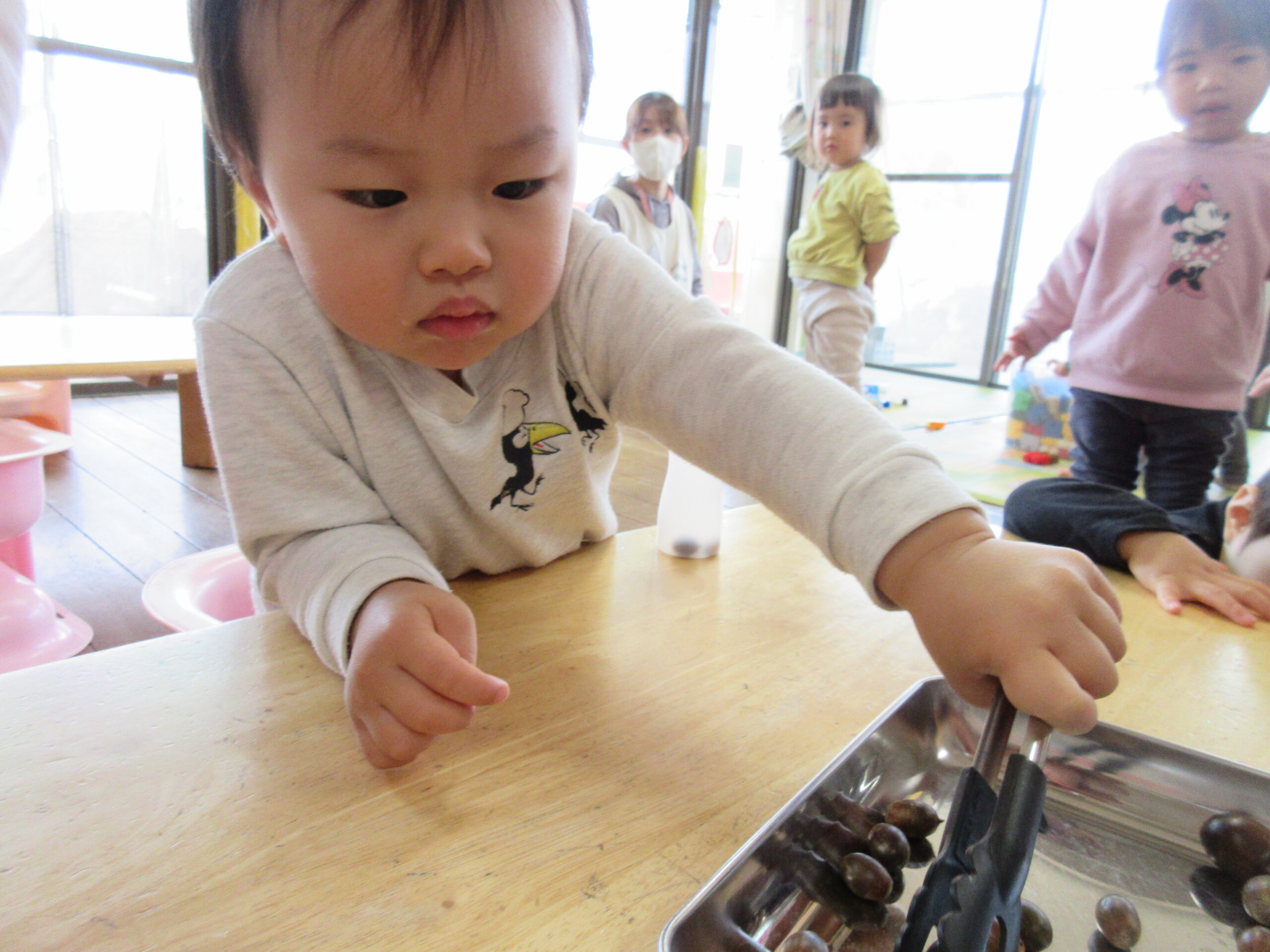 三の丸公園で拾ったドングリをトングを使い容器にいれる子どもたち!