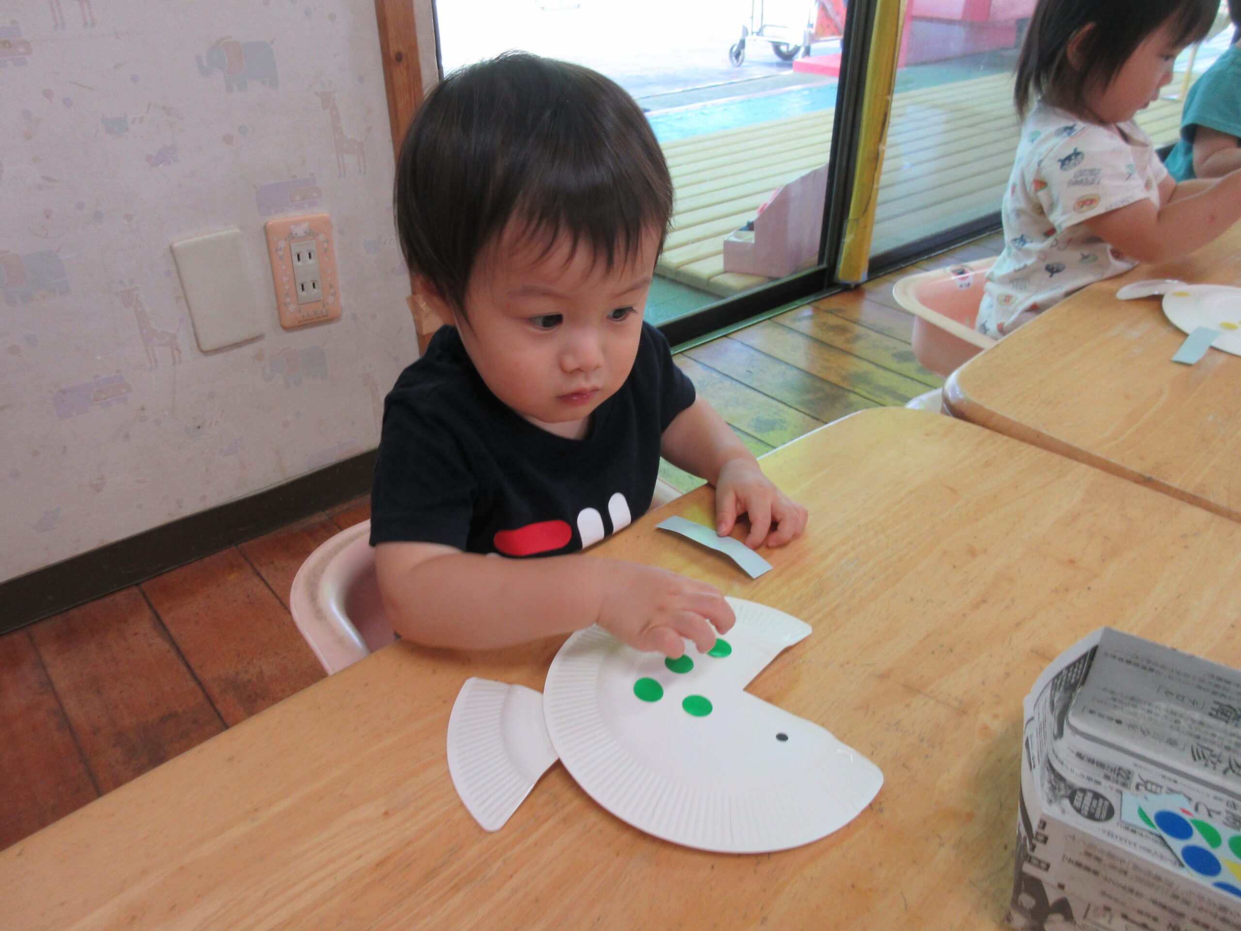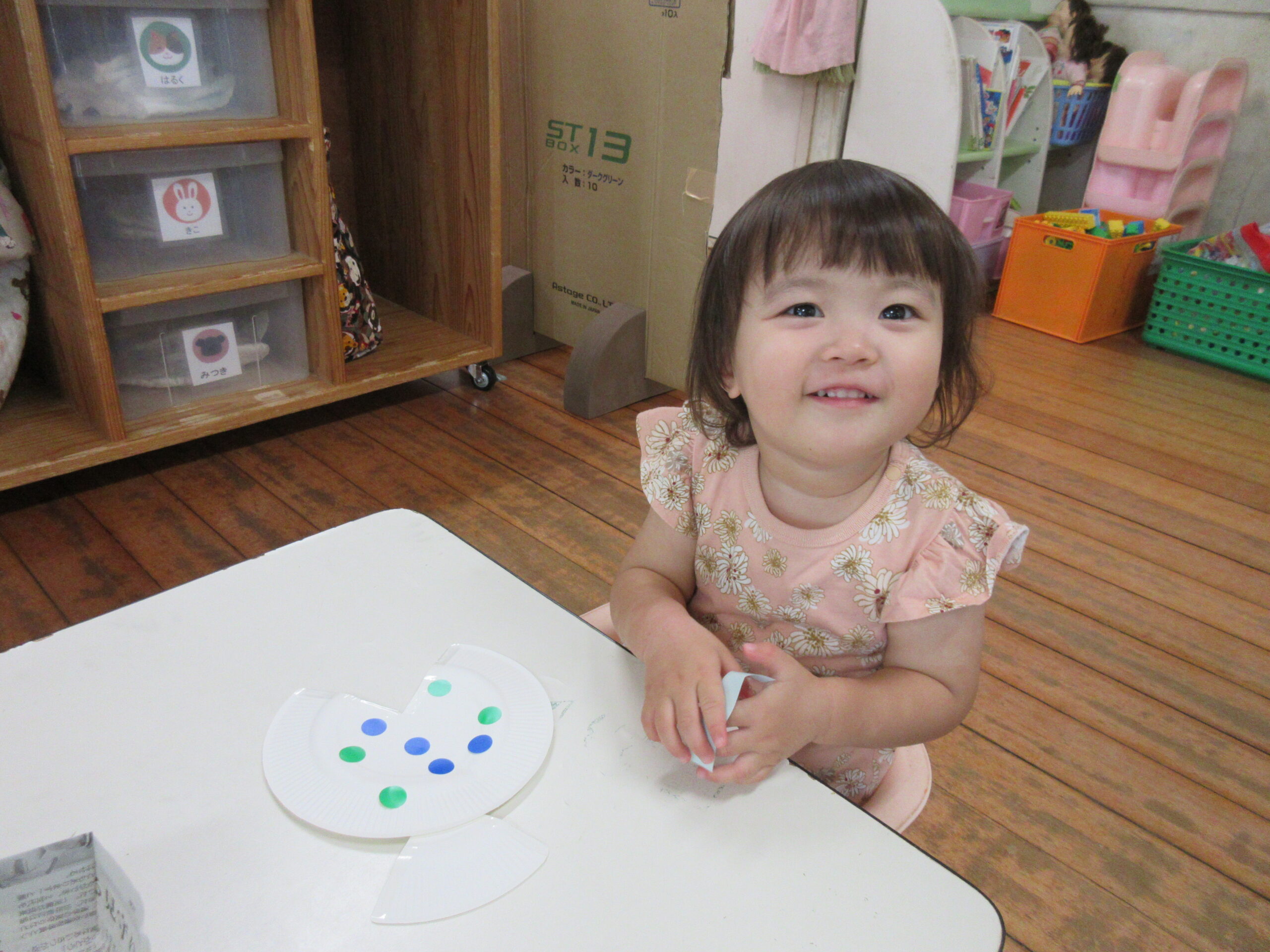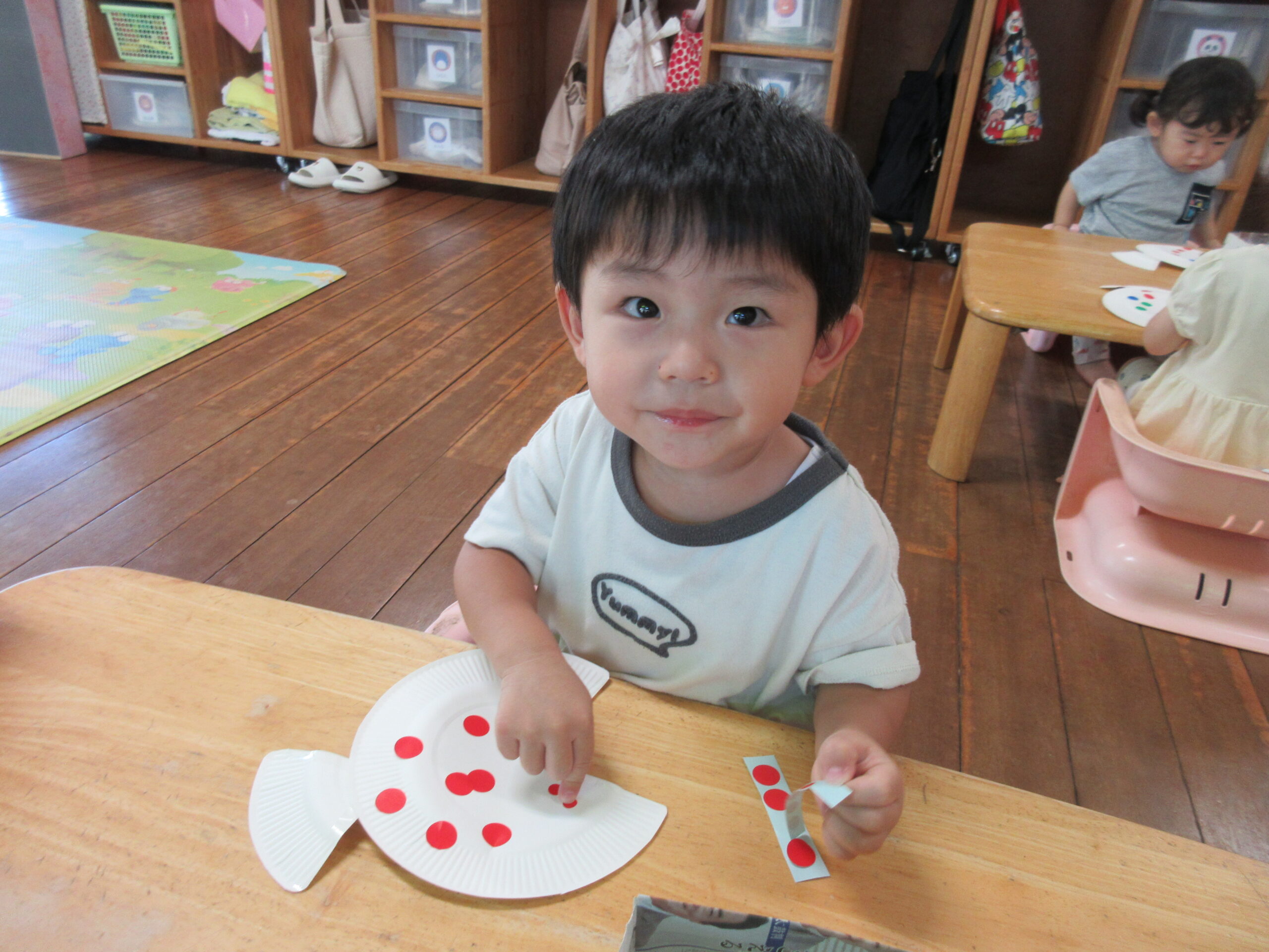 2025.09.29 楽しい制作活動⭐ 室内での遊びを満喫しているうさぎ組さん🐰 制作活動もたくさん楽しみました✨ ペットボトルの蓋でブドウを作ったり・・・🍇 好きな色、大きさの丸シールを貼ってオリジナルのおさかなを作りました🐟 最近のブームはパズルで、向きを考えながら真剣にハメています😊 他にもアイスをみんなで食べたり🍧段ボールに乗って走ったり🚙ぞう組さんとの交流を楽しんだり🐘 夏を満喫したうさぎ組さん!秋ならではの遊びも楽しみですね💙