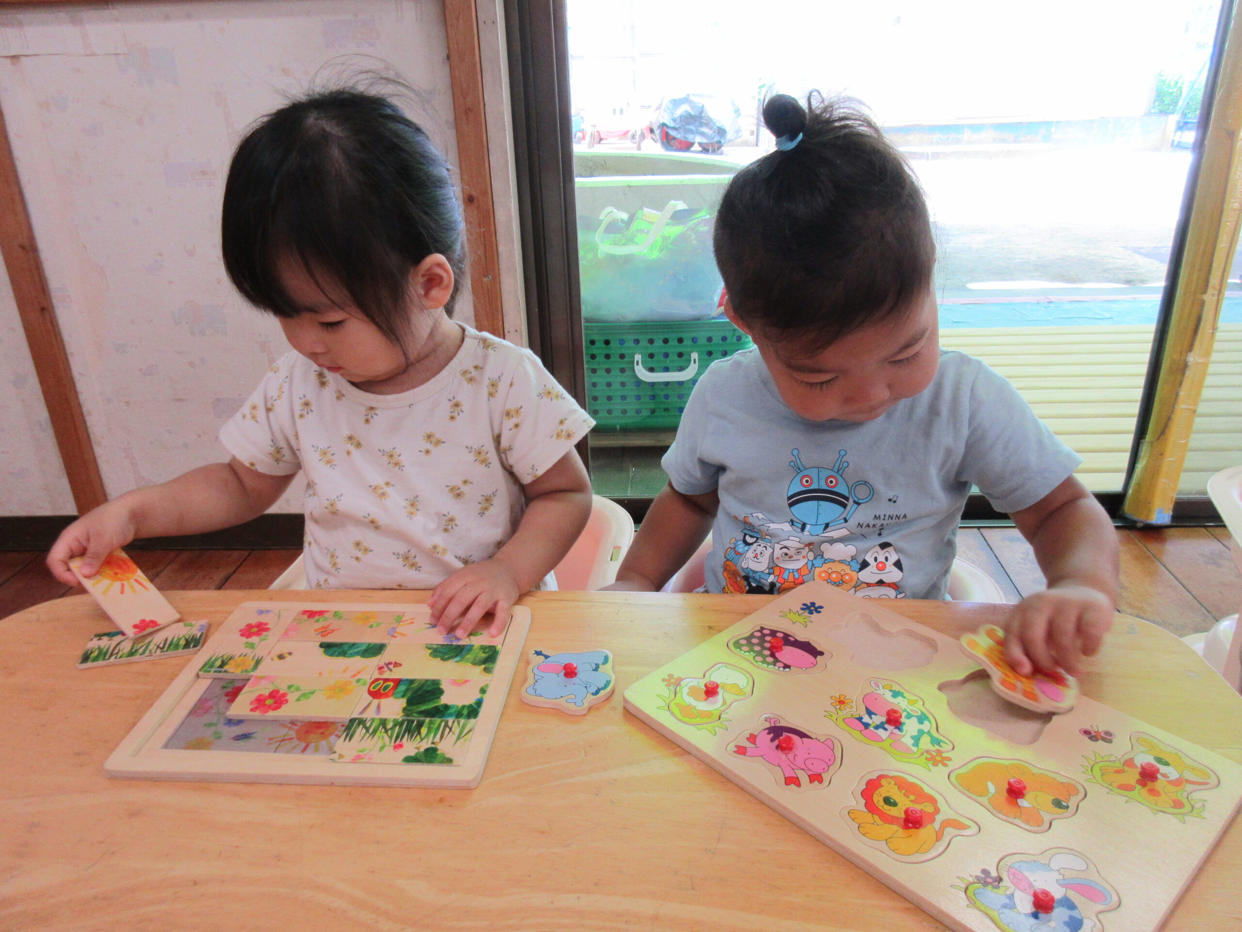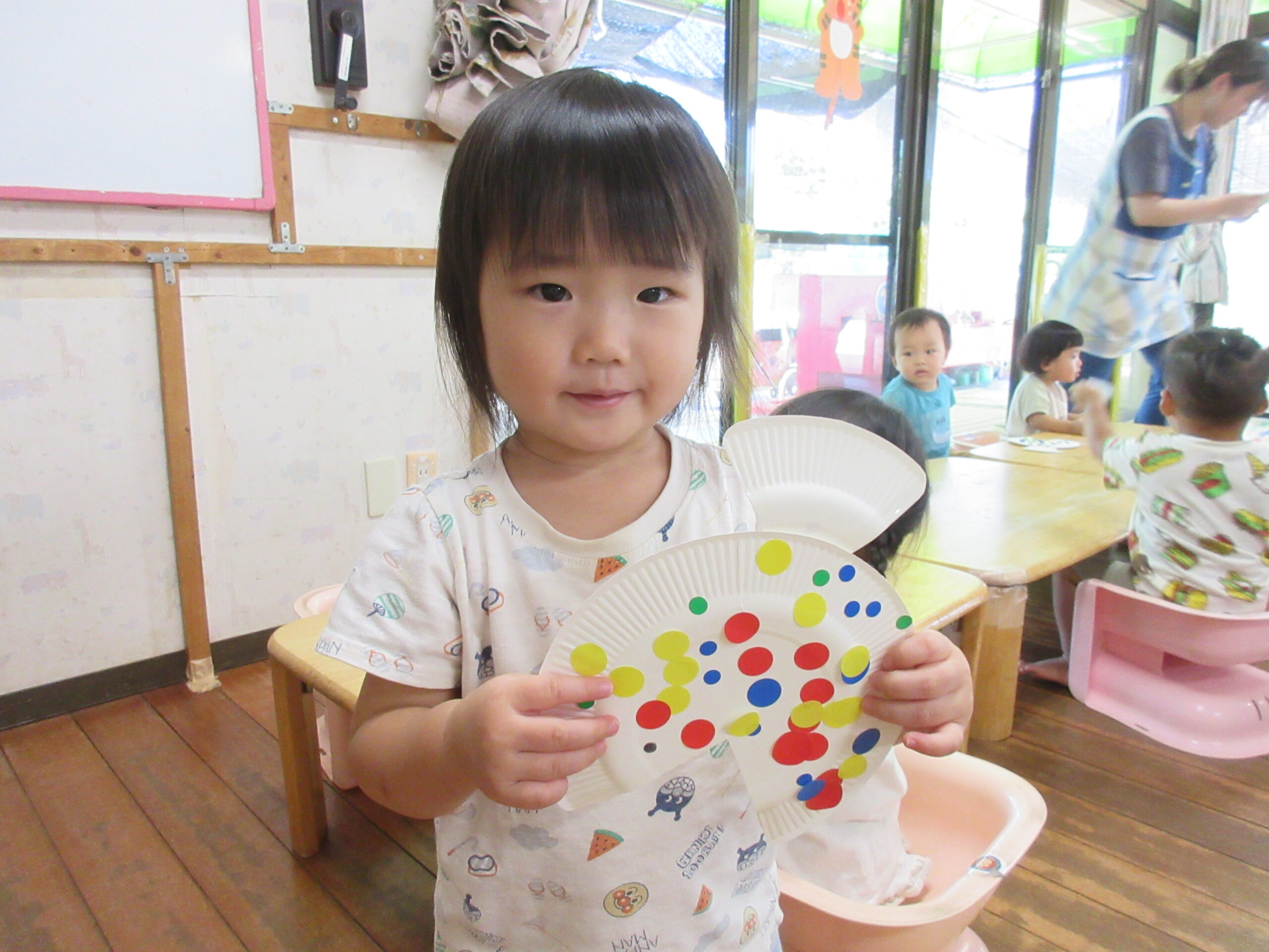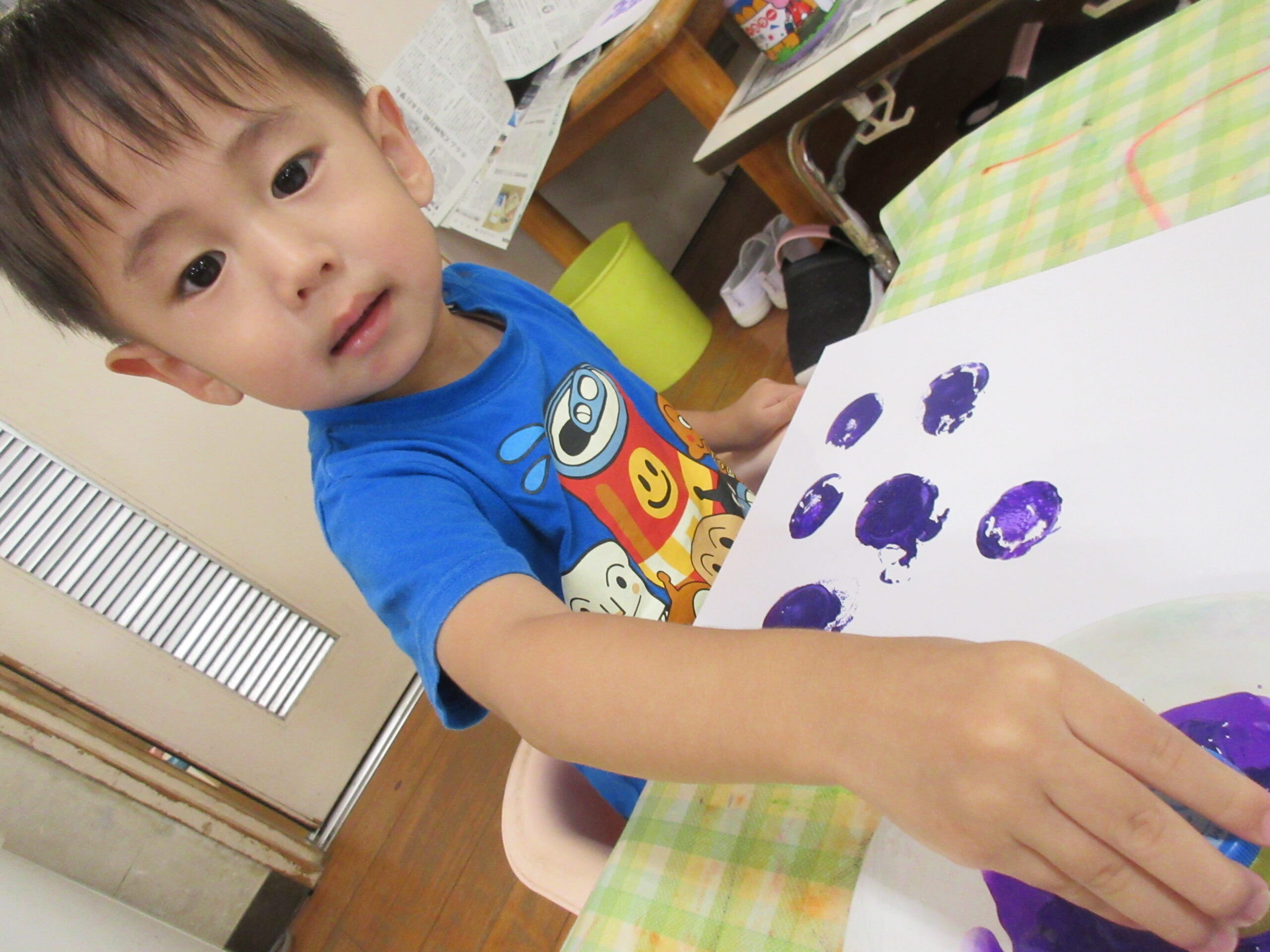 2025.09.29 楽しい制作活動⭐ 室内での遊びを満喫しているうさぎ組さん🐰 制作活動もたくさん楽しみました✨ ペットボトルの蓋でブドウを作ったり・・・🍇 好きな色、大きさの丸シールを貼ってオリジナルのおさかなを作りました🐟 最近のブームはパズルで、向きを考えながら真剣にハメています😊 他にもアイスをみんなで食べたり🍧段ボールに乗って走ったり🚙ぞう組さんとの交流を楽しんだり🐘 夏を満喫したうさぎ組さん!秋ならではの遊びも楽しみですね💙