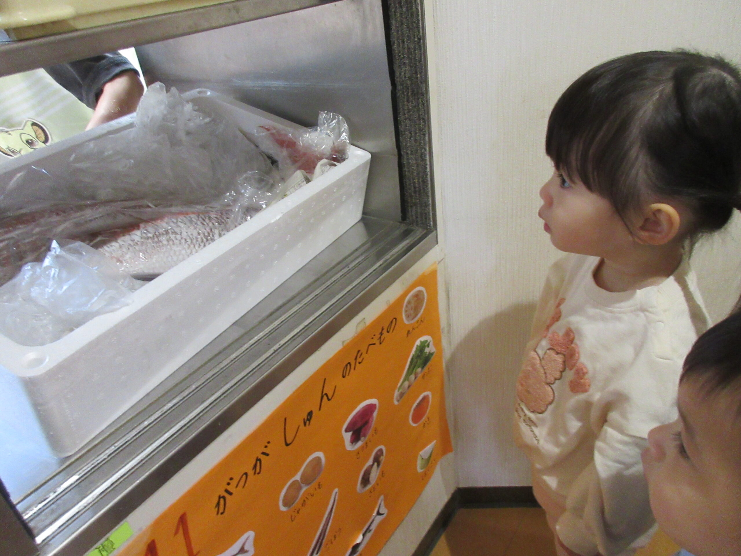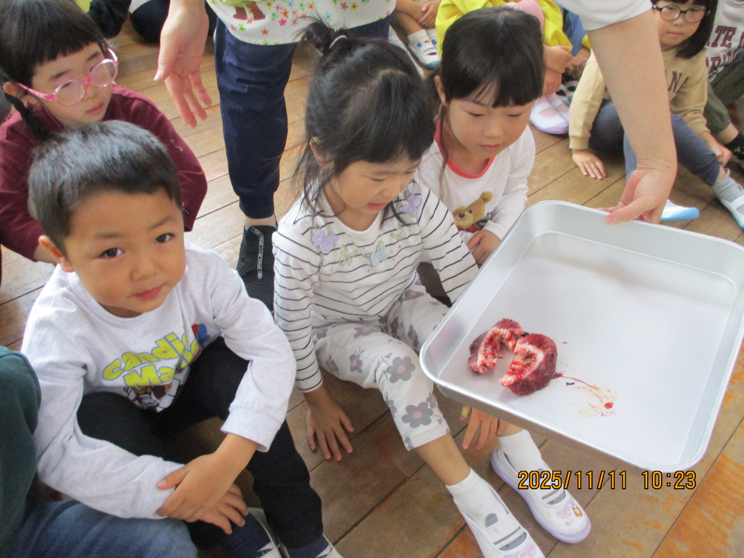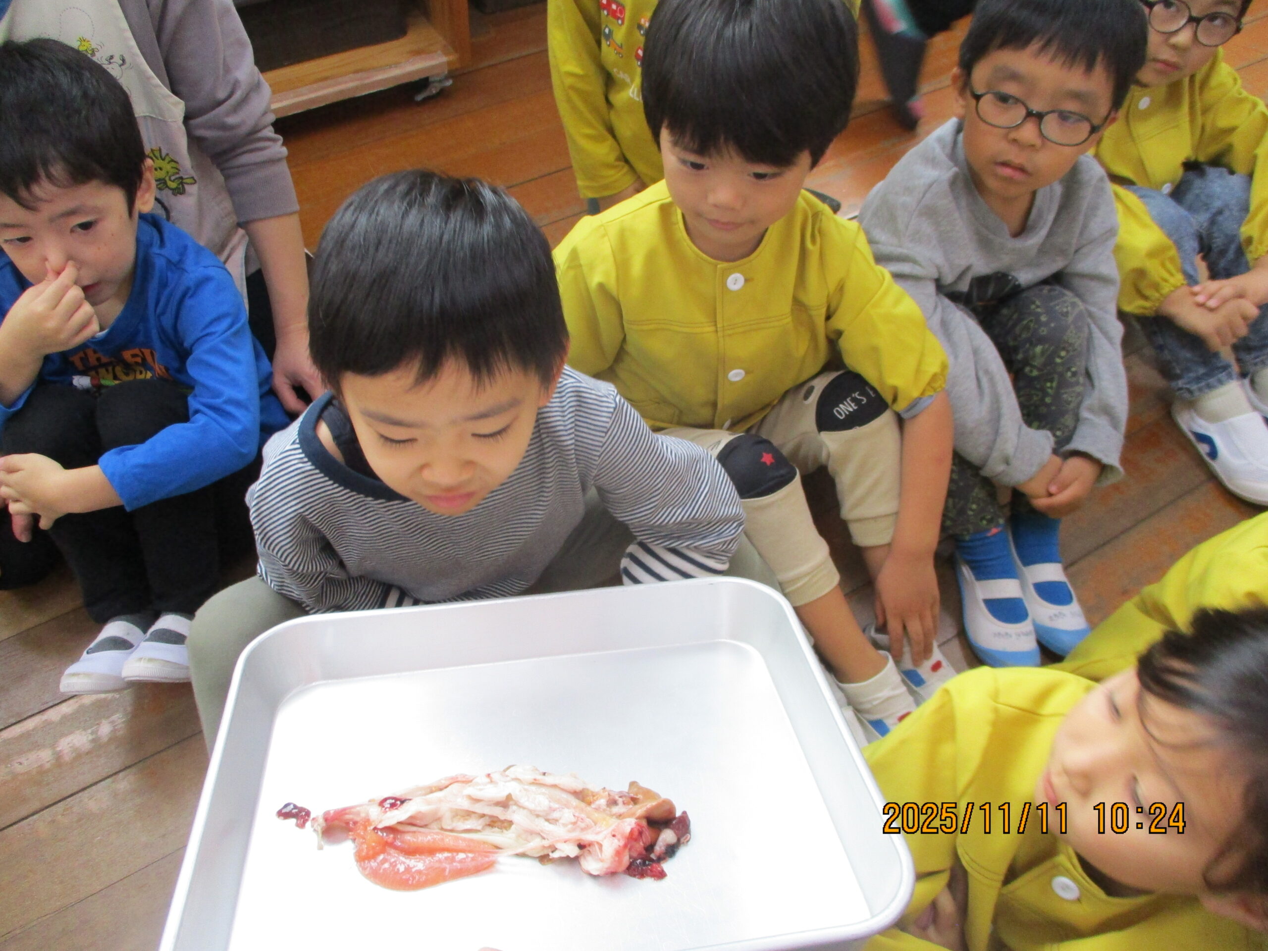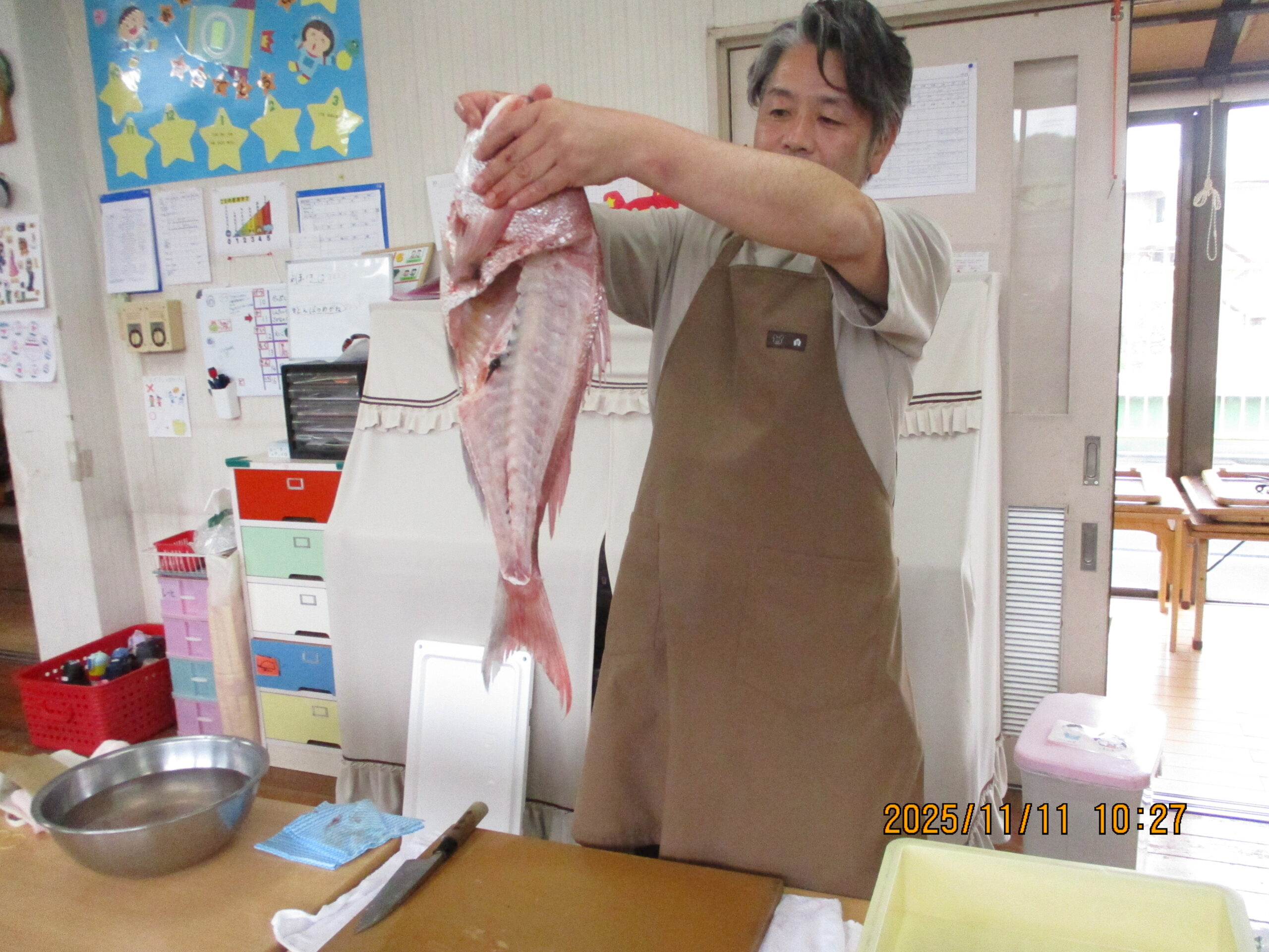 2025.11.11 魚の解体ショー🐟 「鯛」を解体する場面を近くで見学しました!包丁を入れる瞬間を目の当たりにでき、真剣に見入っていましたよ⭐ 体の部位の名前を知り、ピックアップして見ることができました!良い食育の時間となり、印象に残っていると思います💚 小さいクラスのお友だちも「おさかな!」と興味津々でした。
