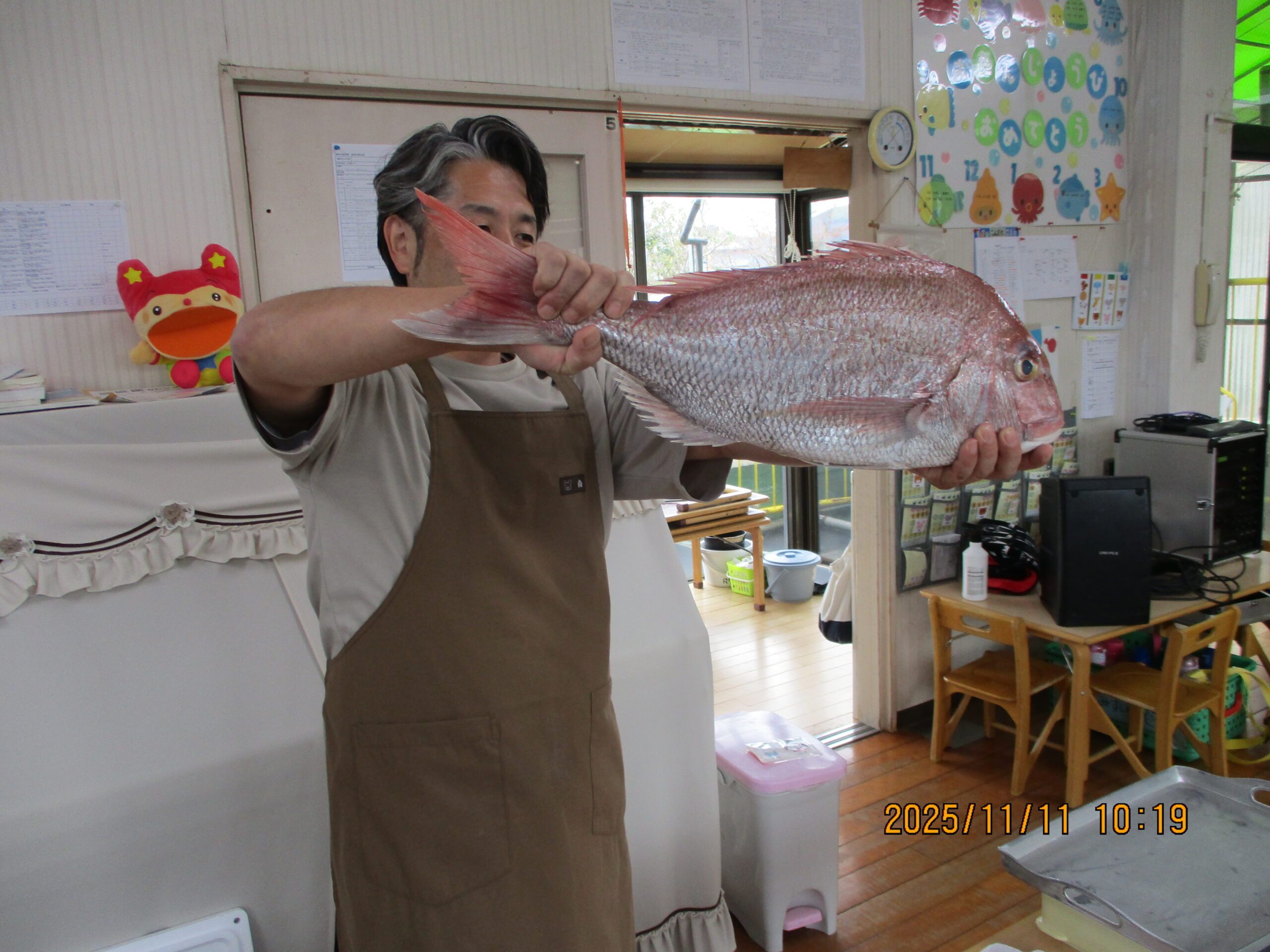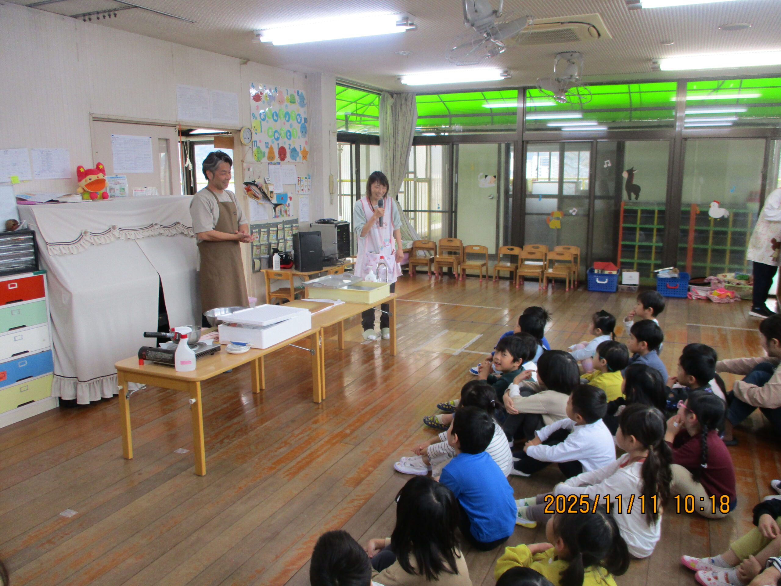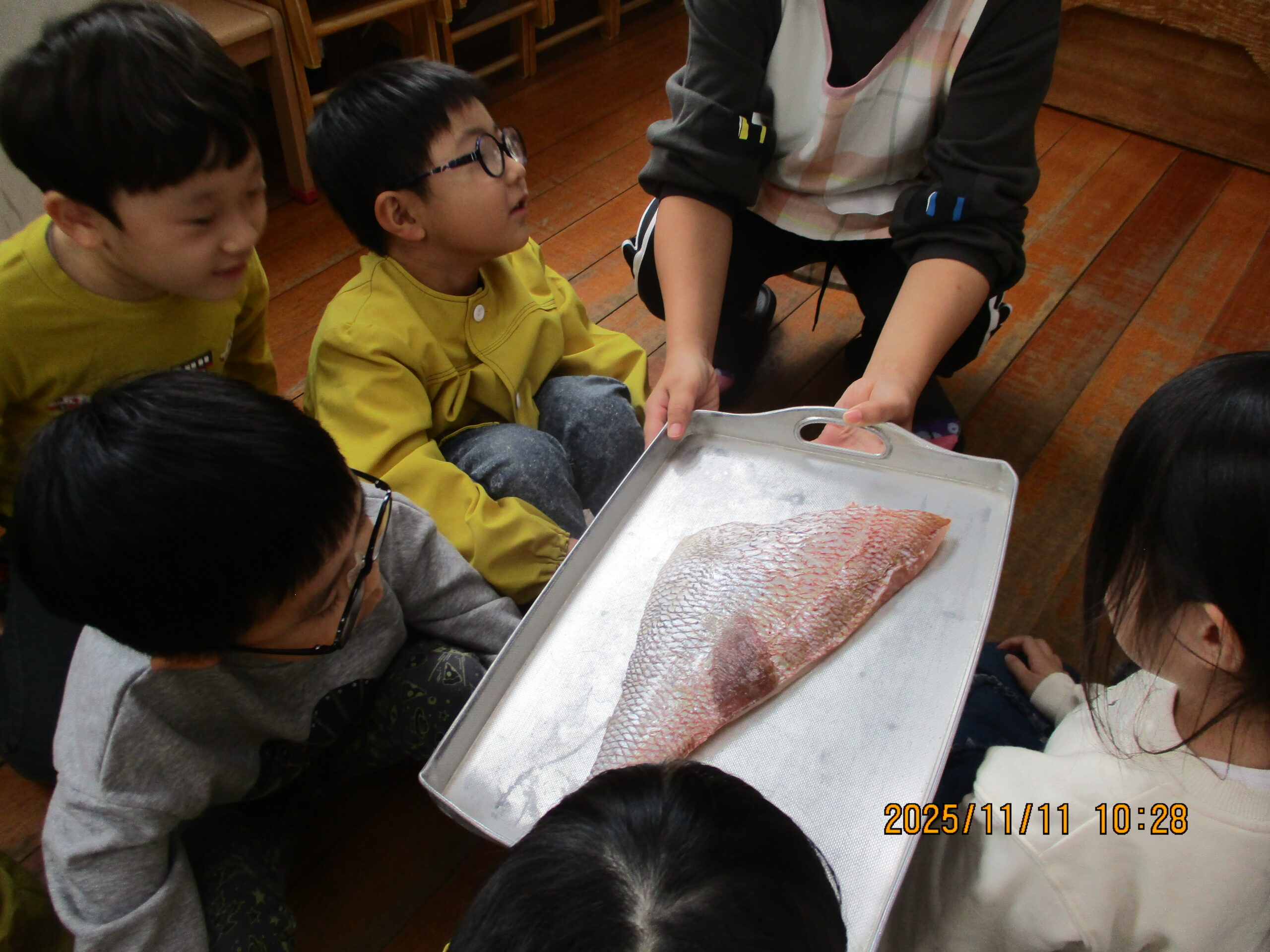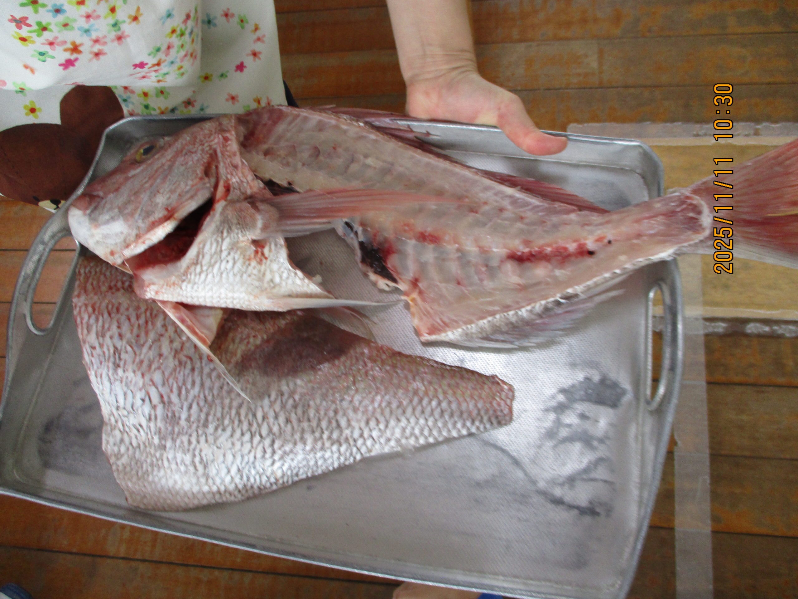 2025.11.11 魚の解体ショー🐟 「鯛」を解体する場面を近くで見学しました!包丁を入れる瞬間を目の当たりにでき、真剣に見入っていましたよ⭐ 体の部位の名前を知り、ピックアップして見ることができました!良い食育の時間となり、印象に残っていると思います💚 小さいクラスのお友だちも「おさかな!」と興味津々でした。