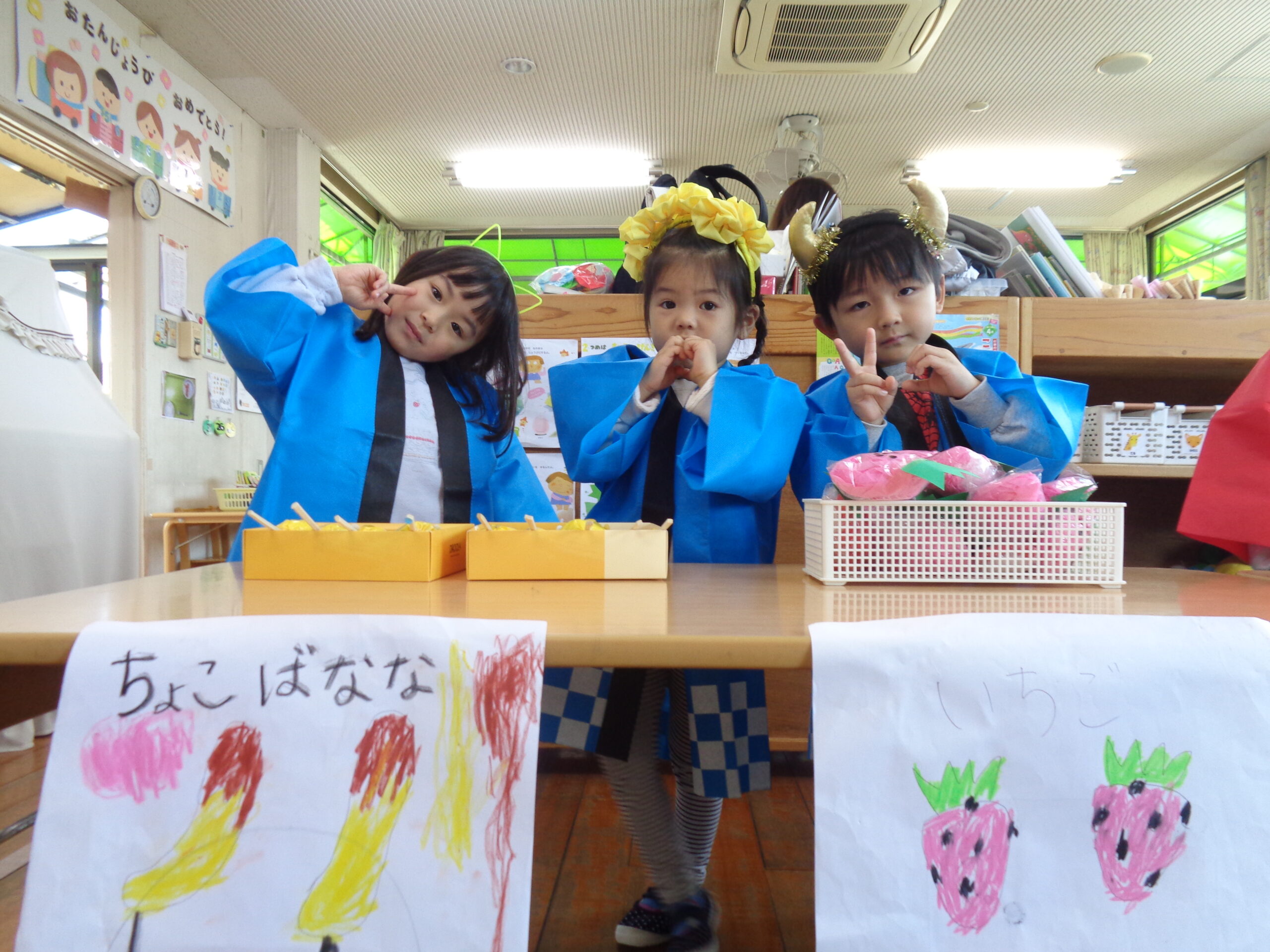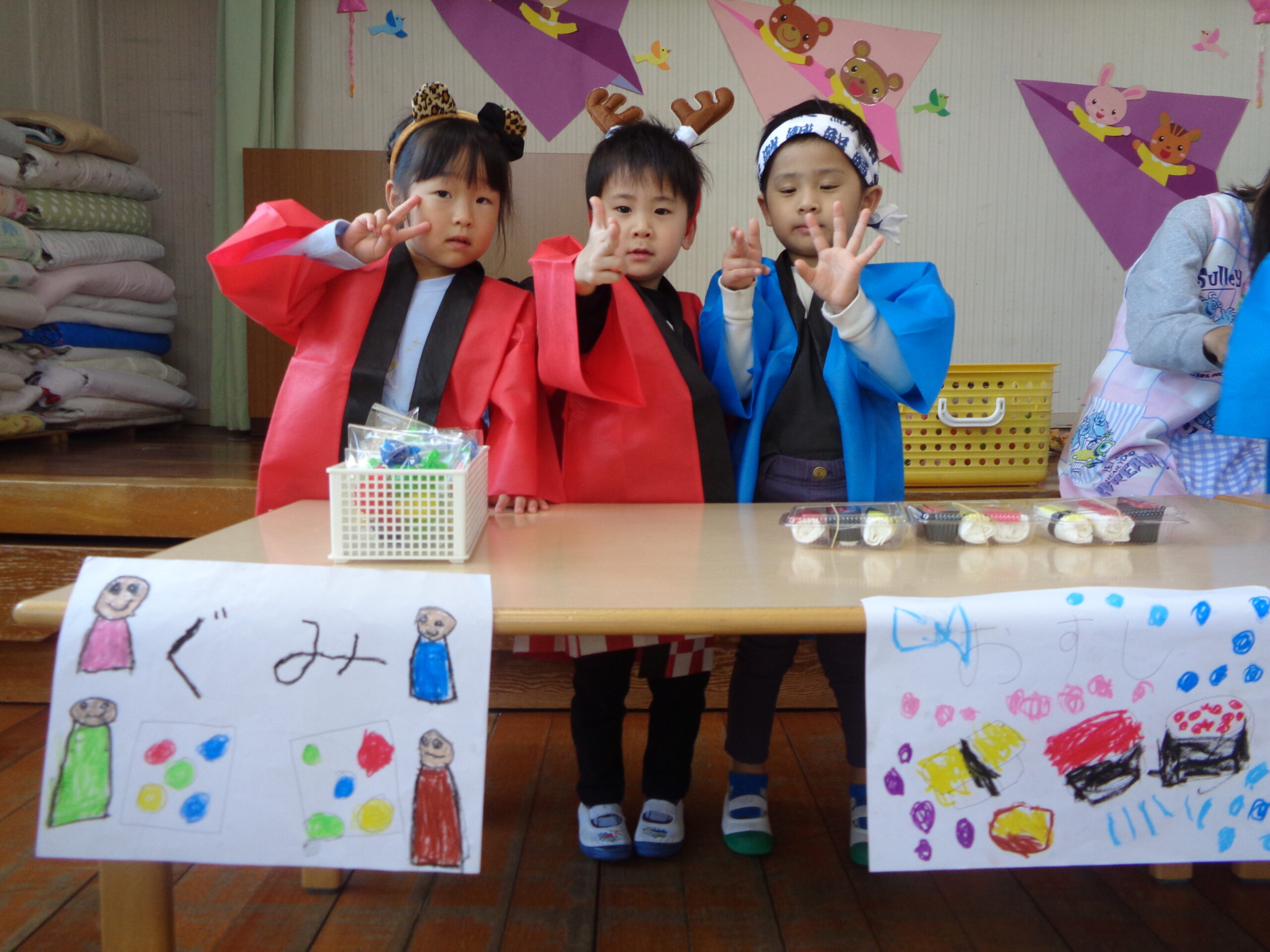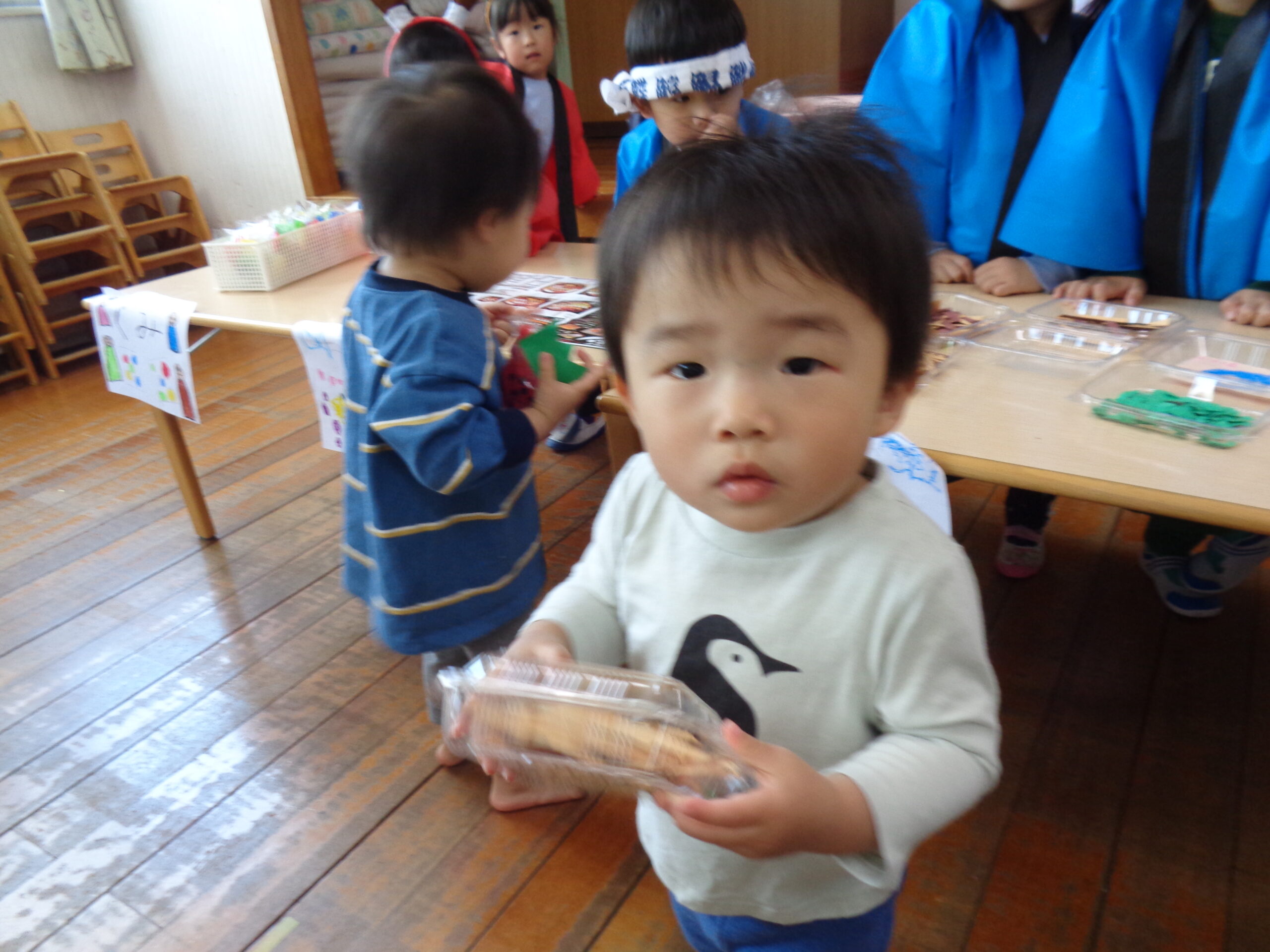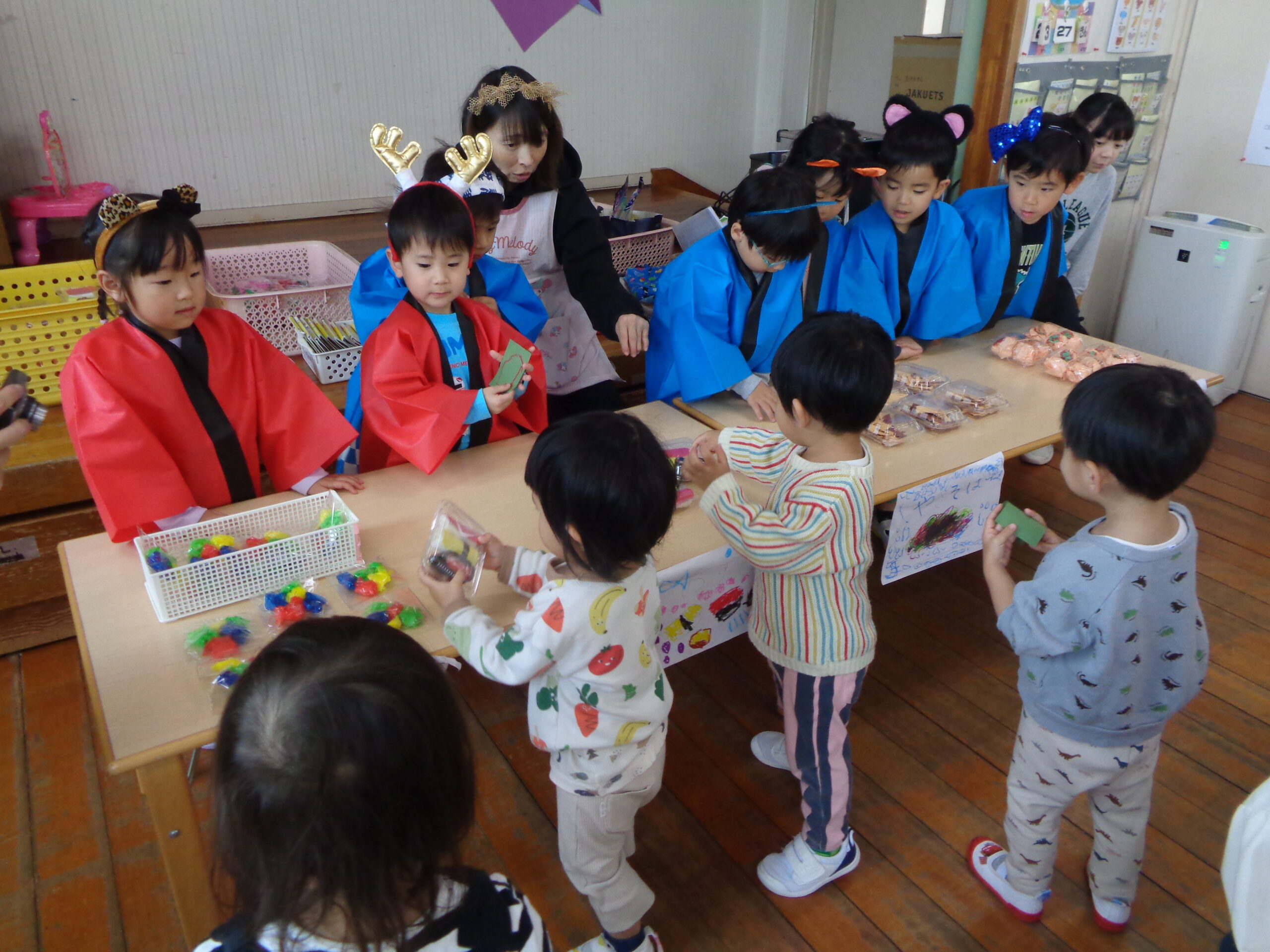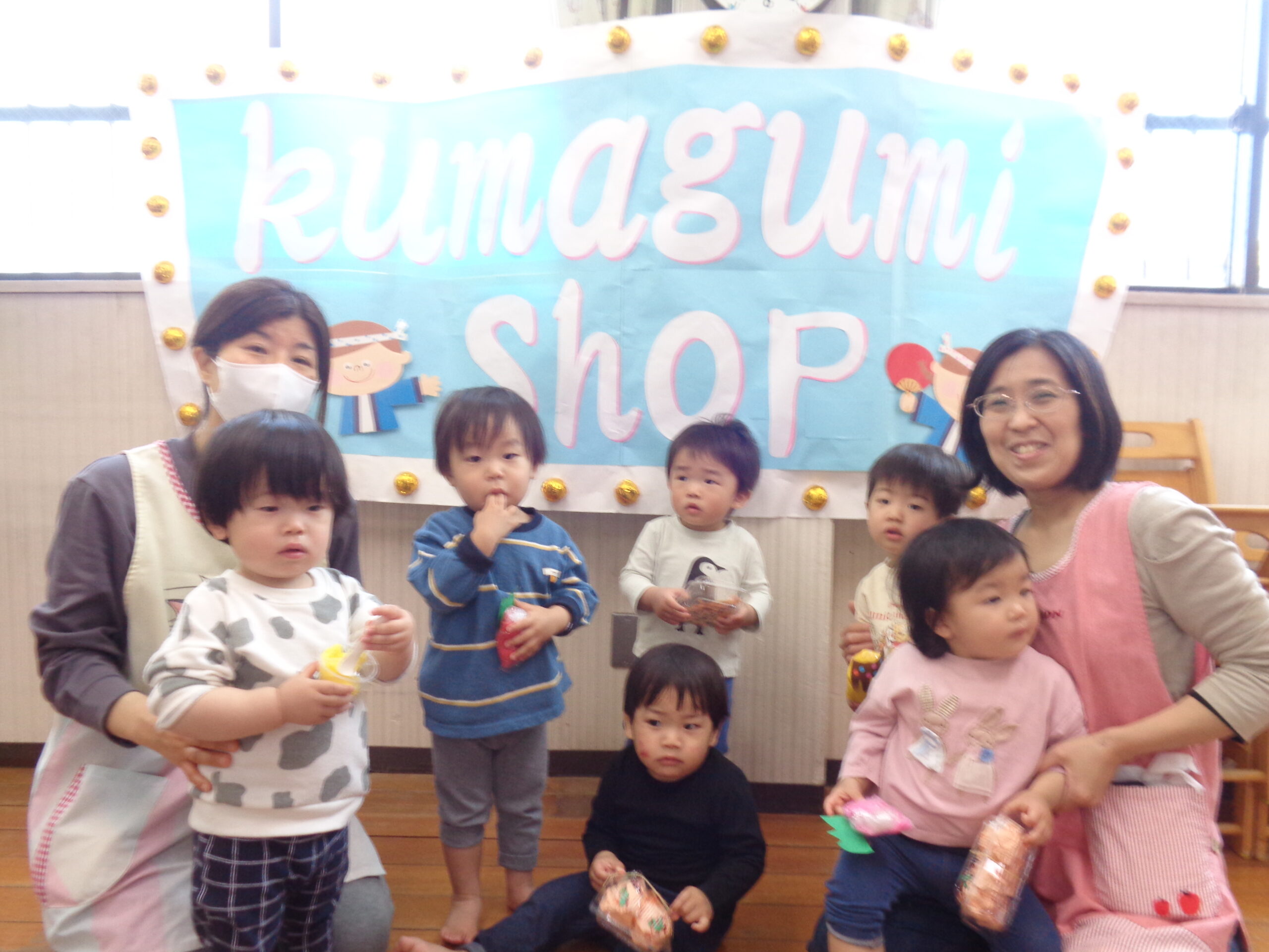 いよいよ当日!お家でも「お店屋さんごっこ」の話題でもちきりだったようで、部屋に入るなり、「先生、今日だね!」といつもに増して笑顔で登園のくま組さん!