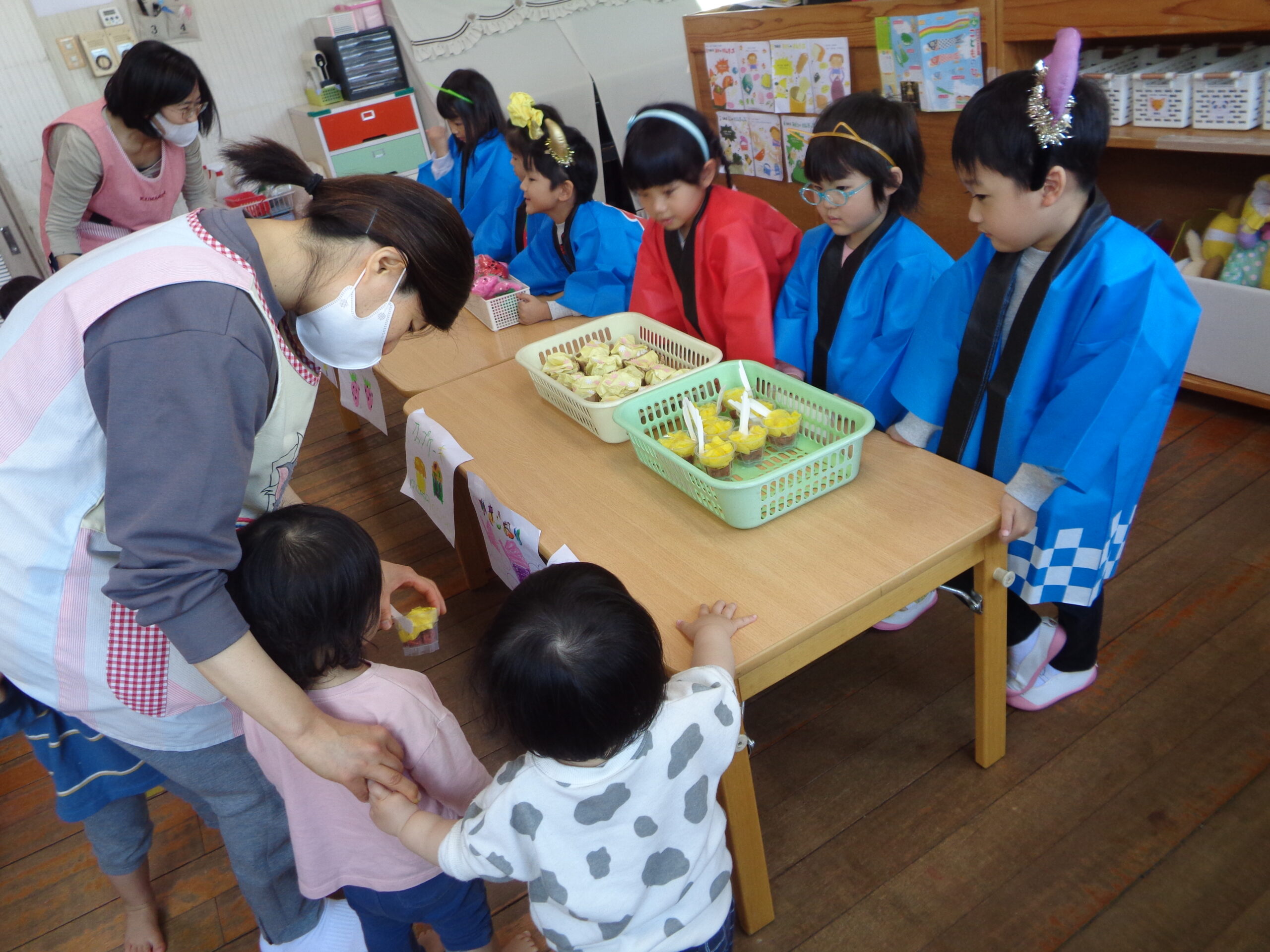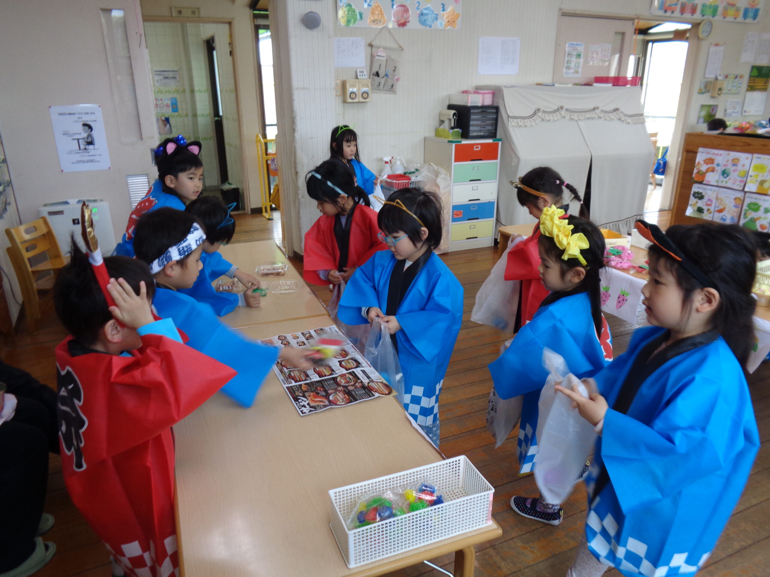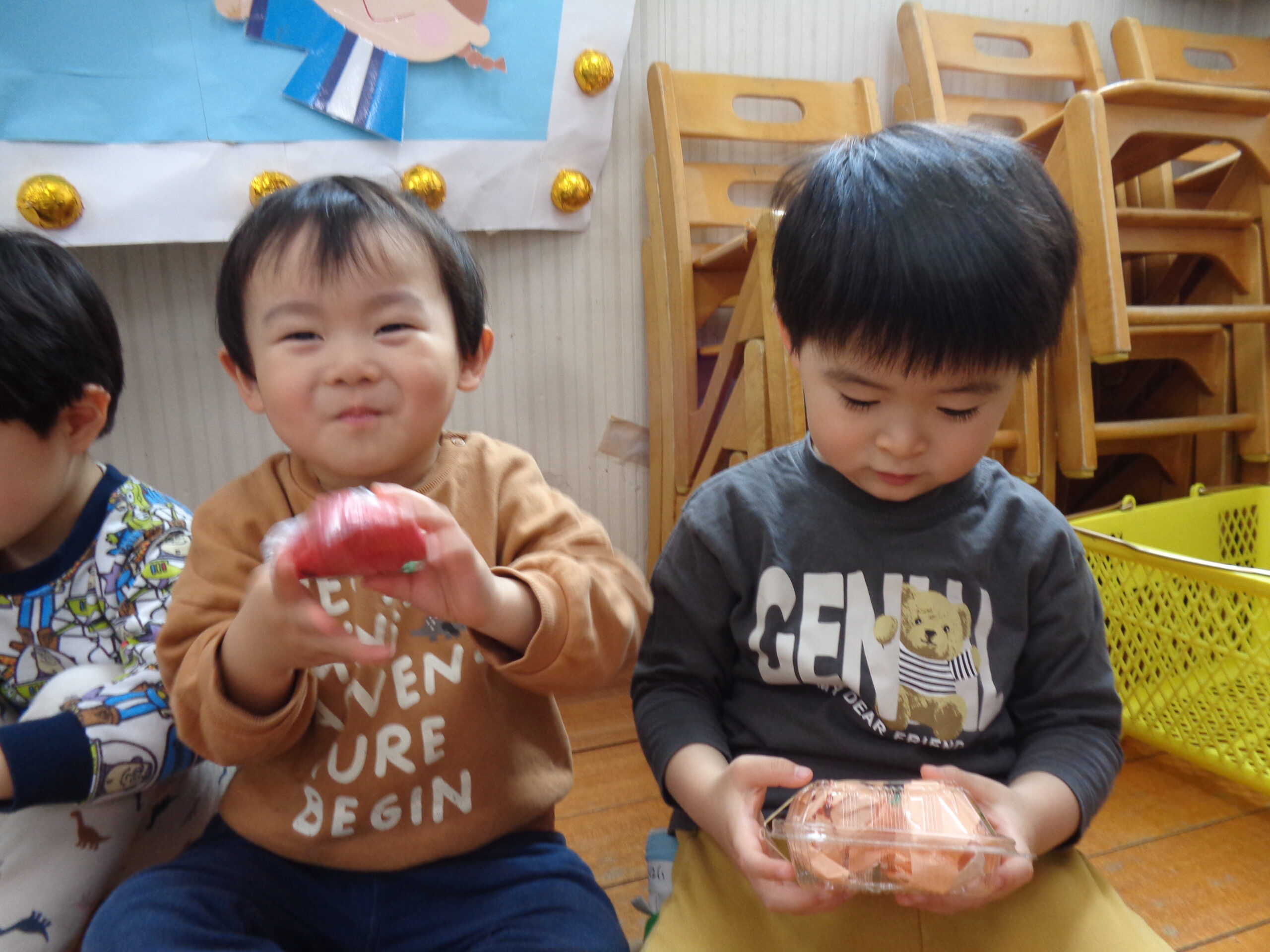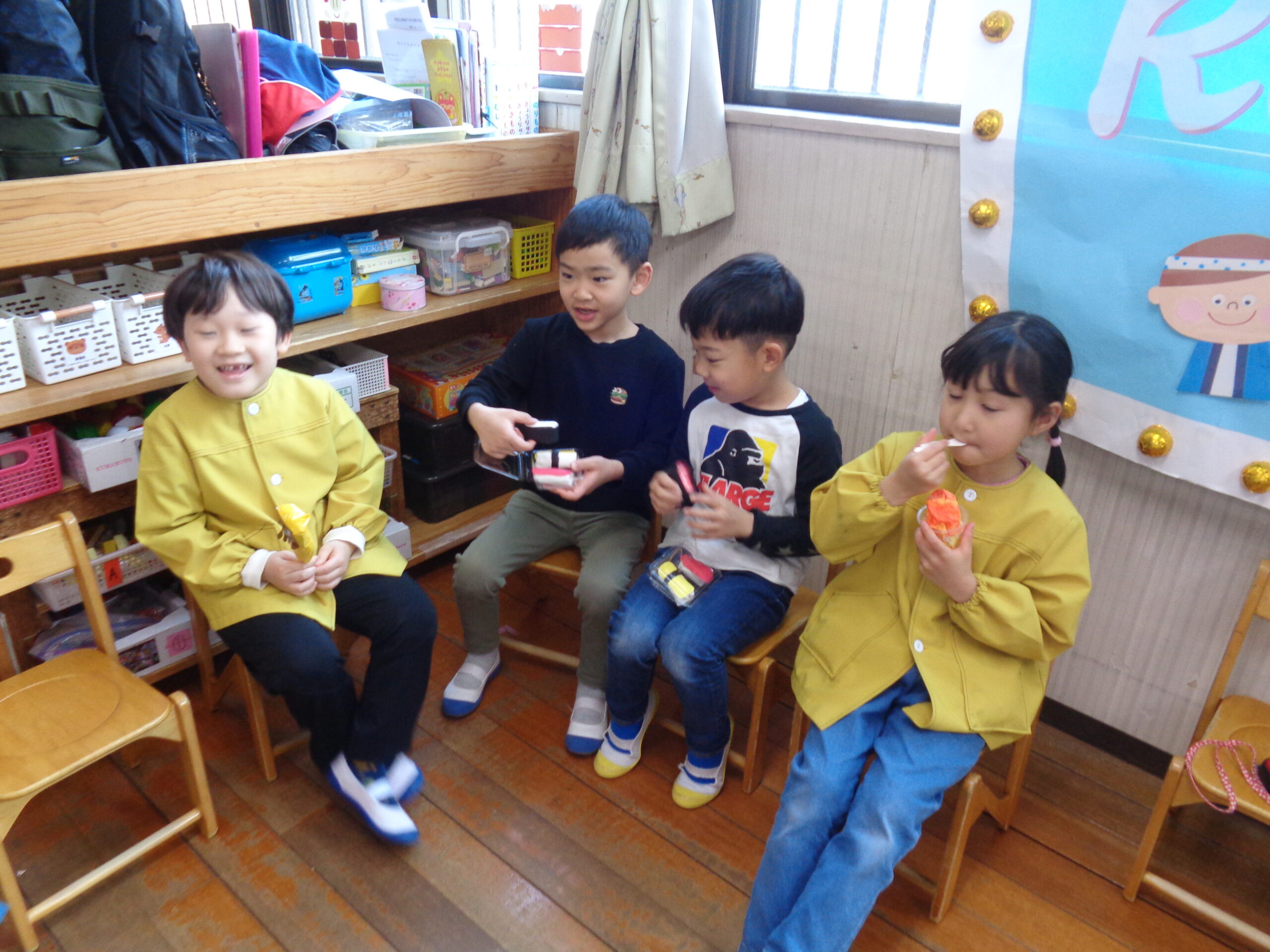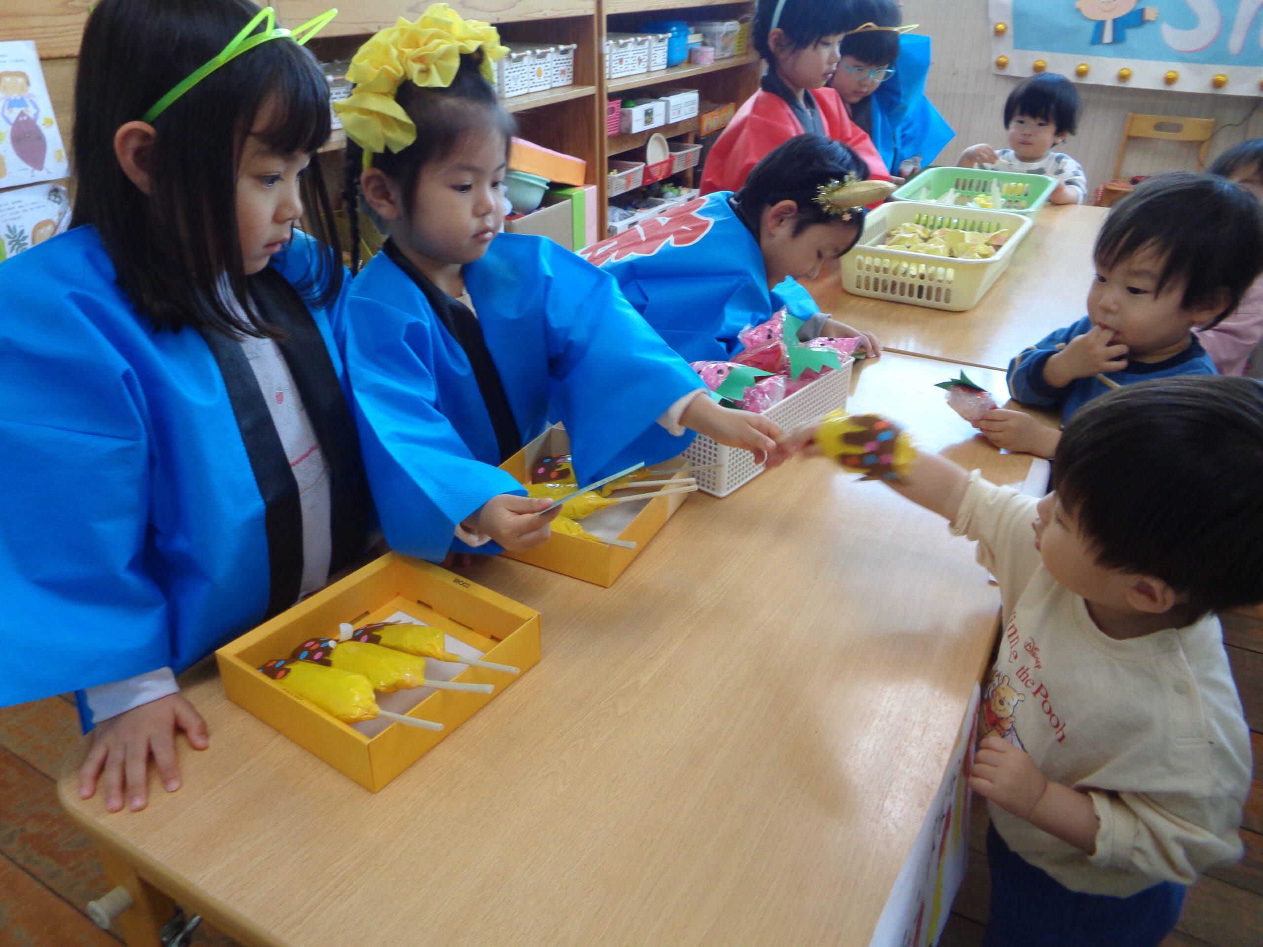 いよいよ当日!お家でも「お店屋さんごっこ」の話題でもちきりだったようで、部屋に入るなり、「先生、今日だね!」といつもに増して笑顔で登園のくま組さん!