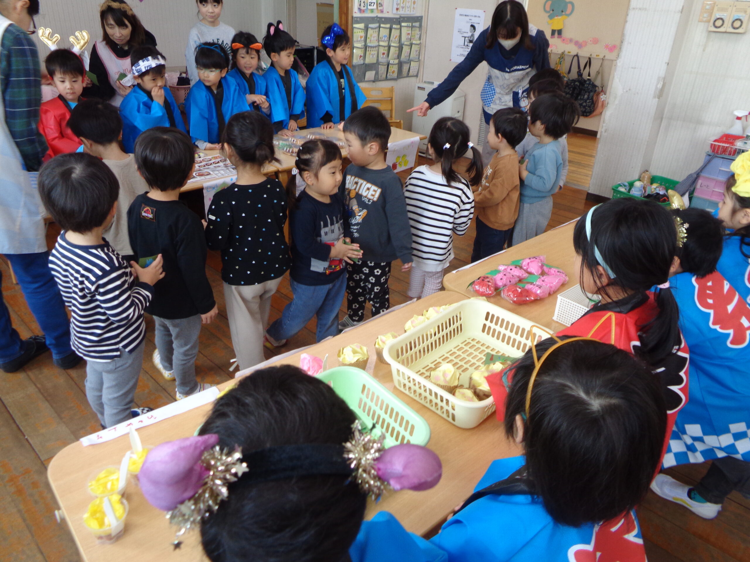 どのお店の店員になるか、役割分担をし、OPENを待ちます!「いらっしゃいませ~」「何がいいいですか~?がいいんじゃない?」と掛け声の案も出し合いながら、声出しの練習もしました。