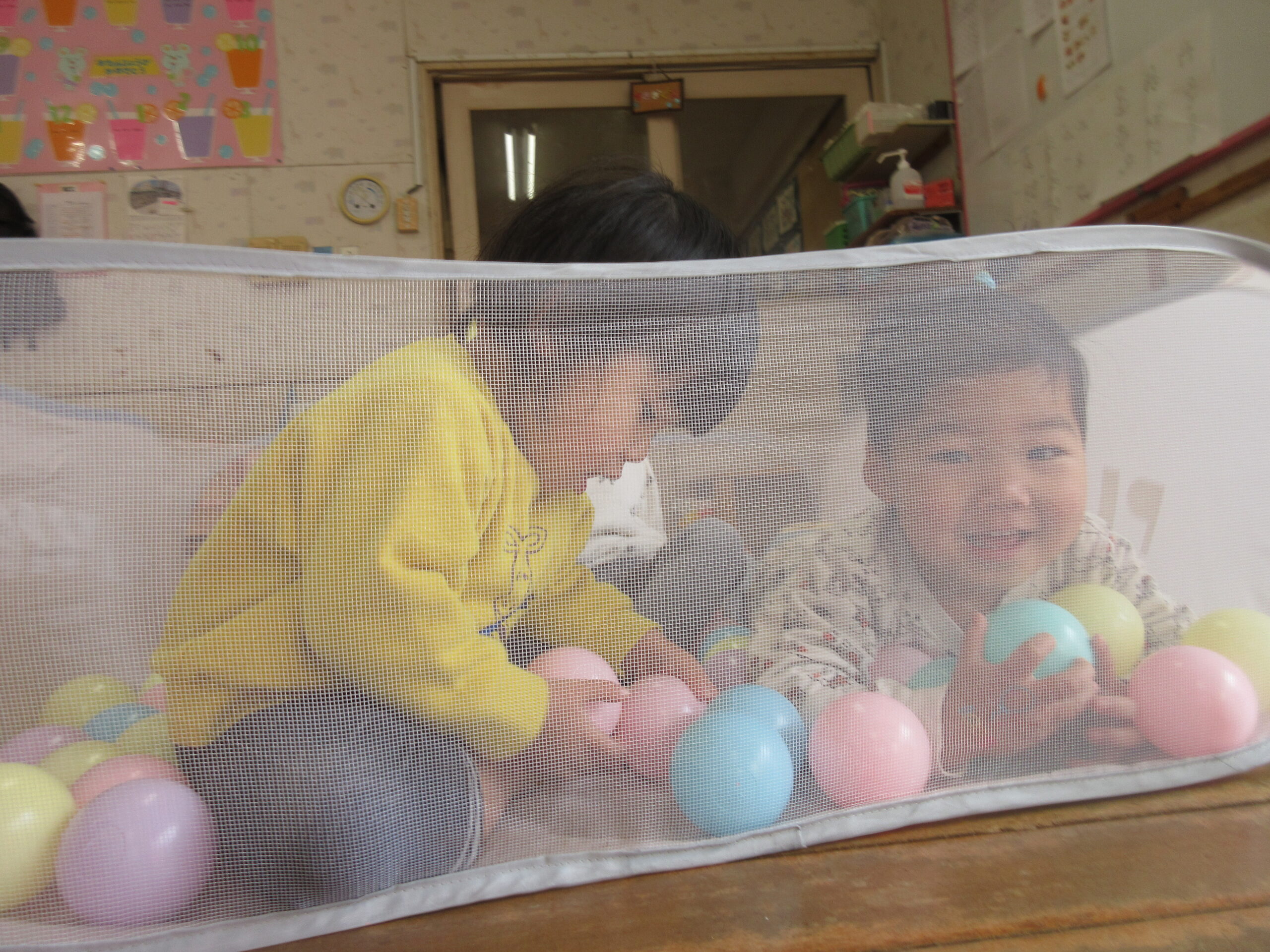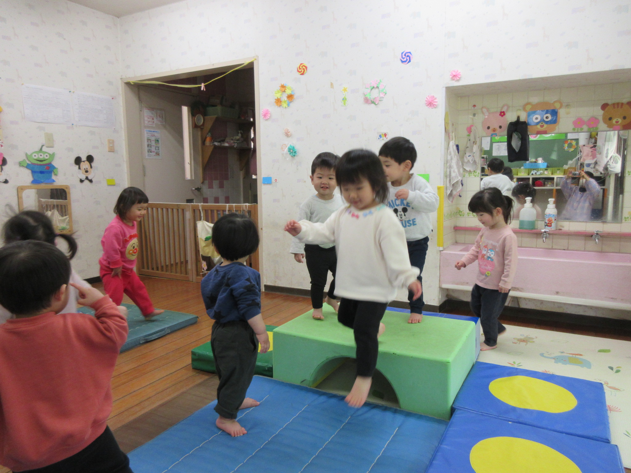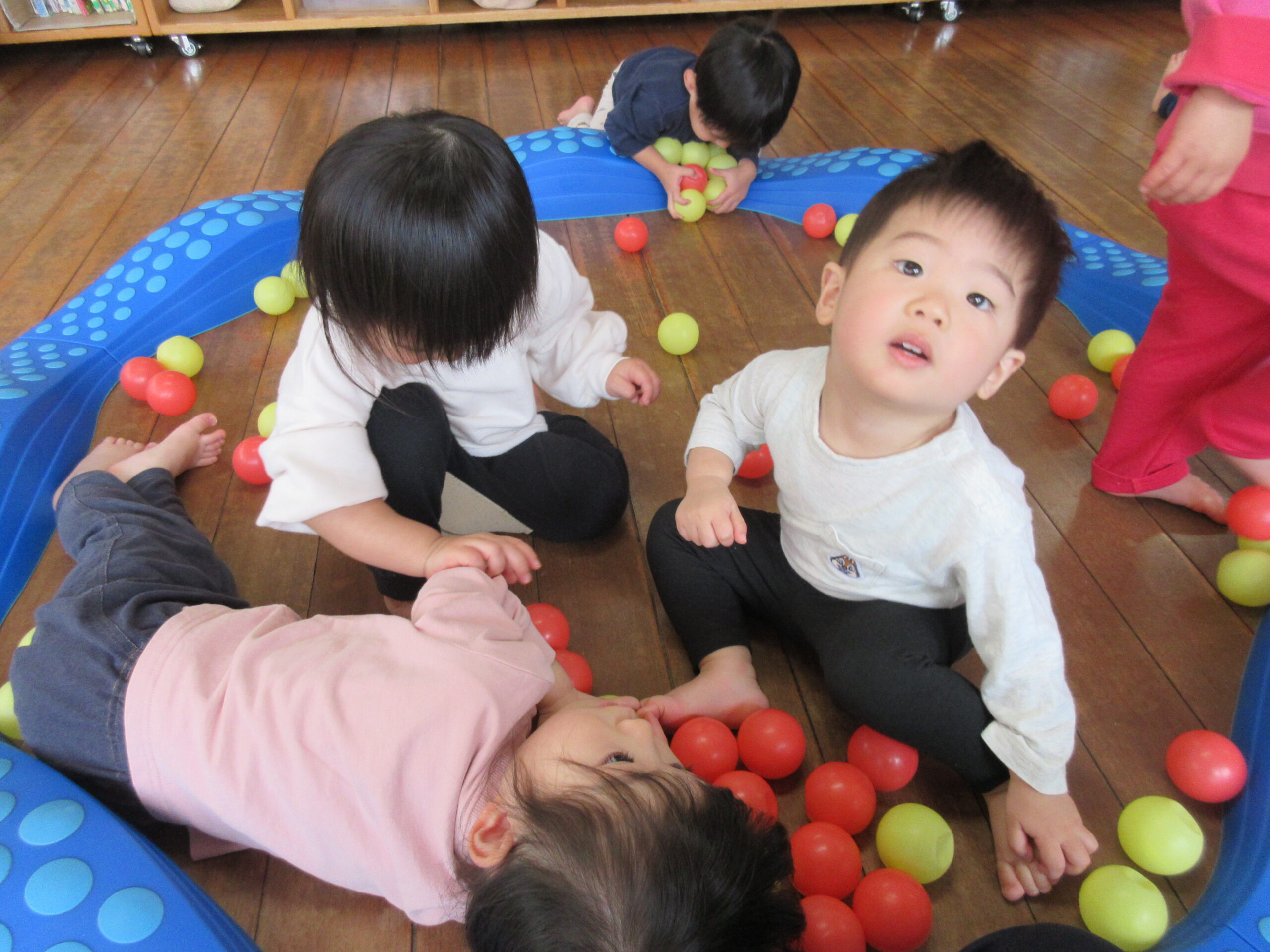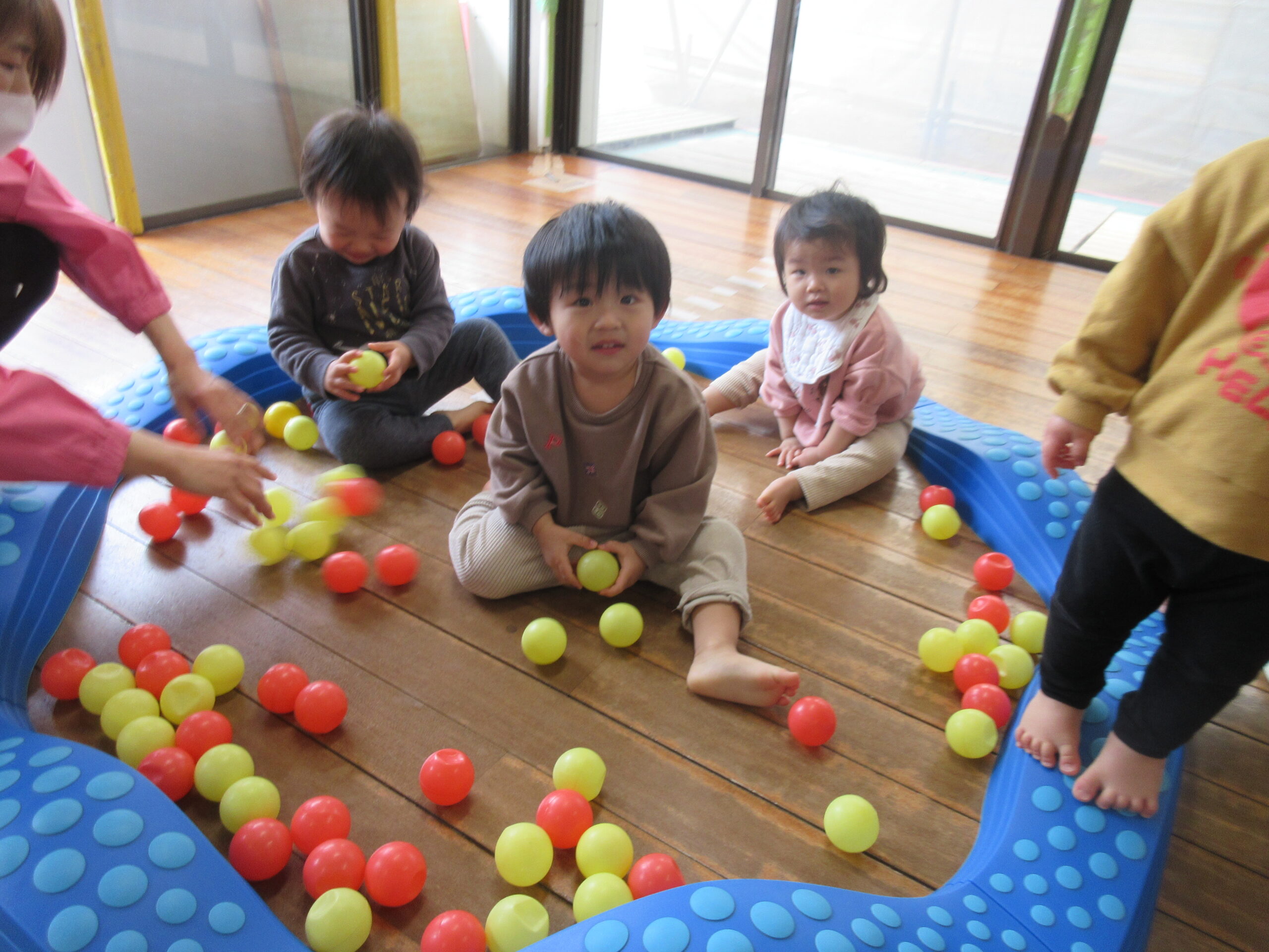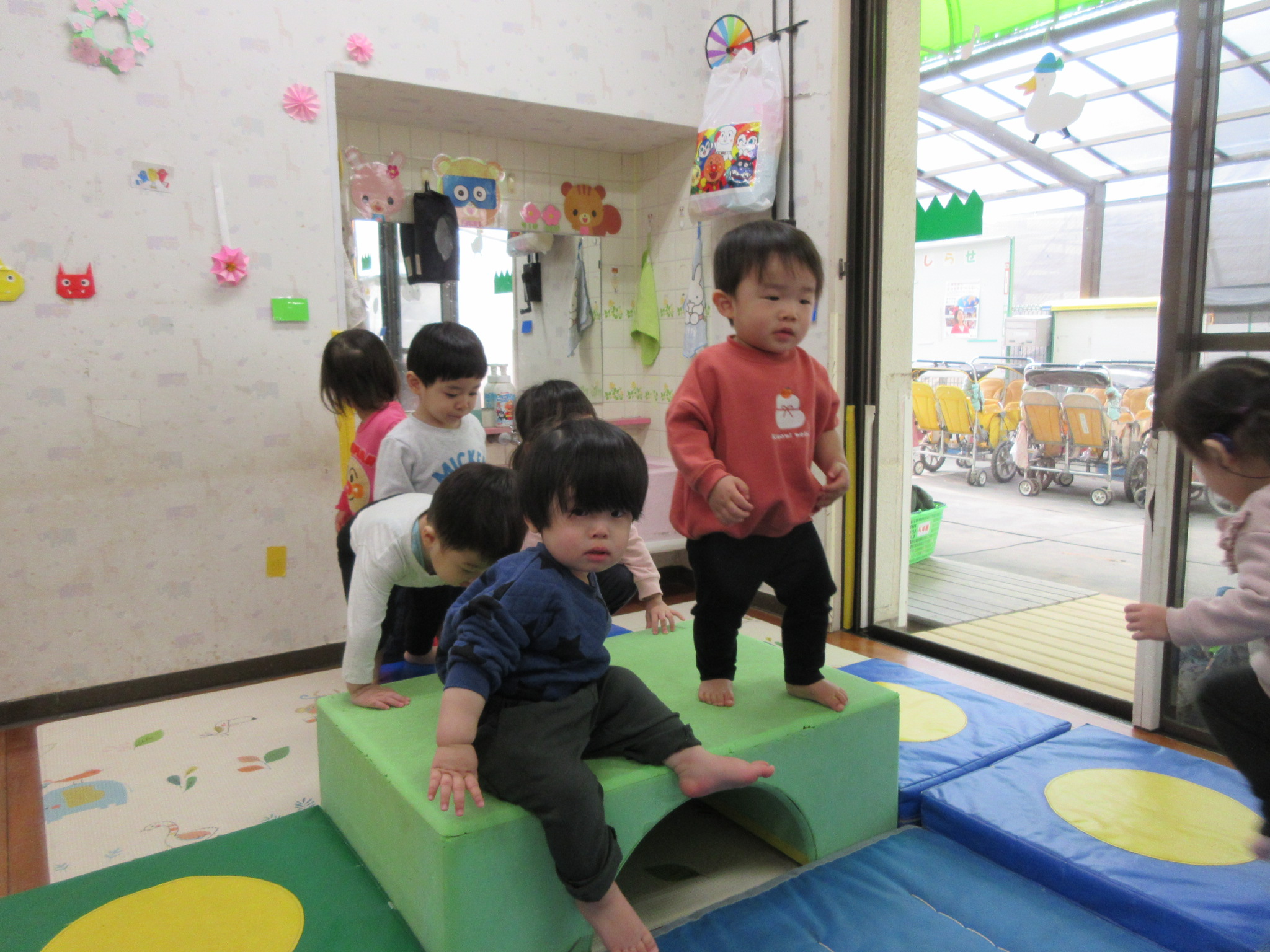 2026.02.13 🐿🐇一緒に遊ぼう! 0歳児りす組さんと、1歳児うさぎ組さんが一緒に遊びました! マットや高低差のある踏み台などを準備して、身体をいっぱい使って運動しました🌟 こちらはボールプールのコーナー。1歳児さんが段差の乗り越えるのに手を差し伸べてくれたり、ボールを「ど~ぞ」と渡してくれたり☻ちょっとだけお兄さん、お姉さんの気分を味わっていました💛