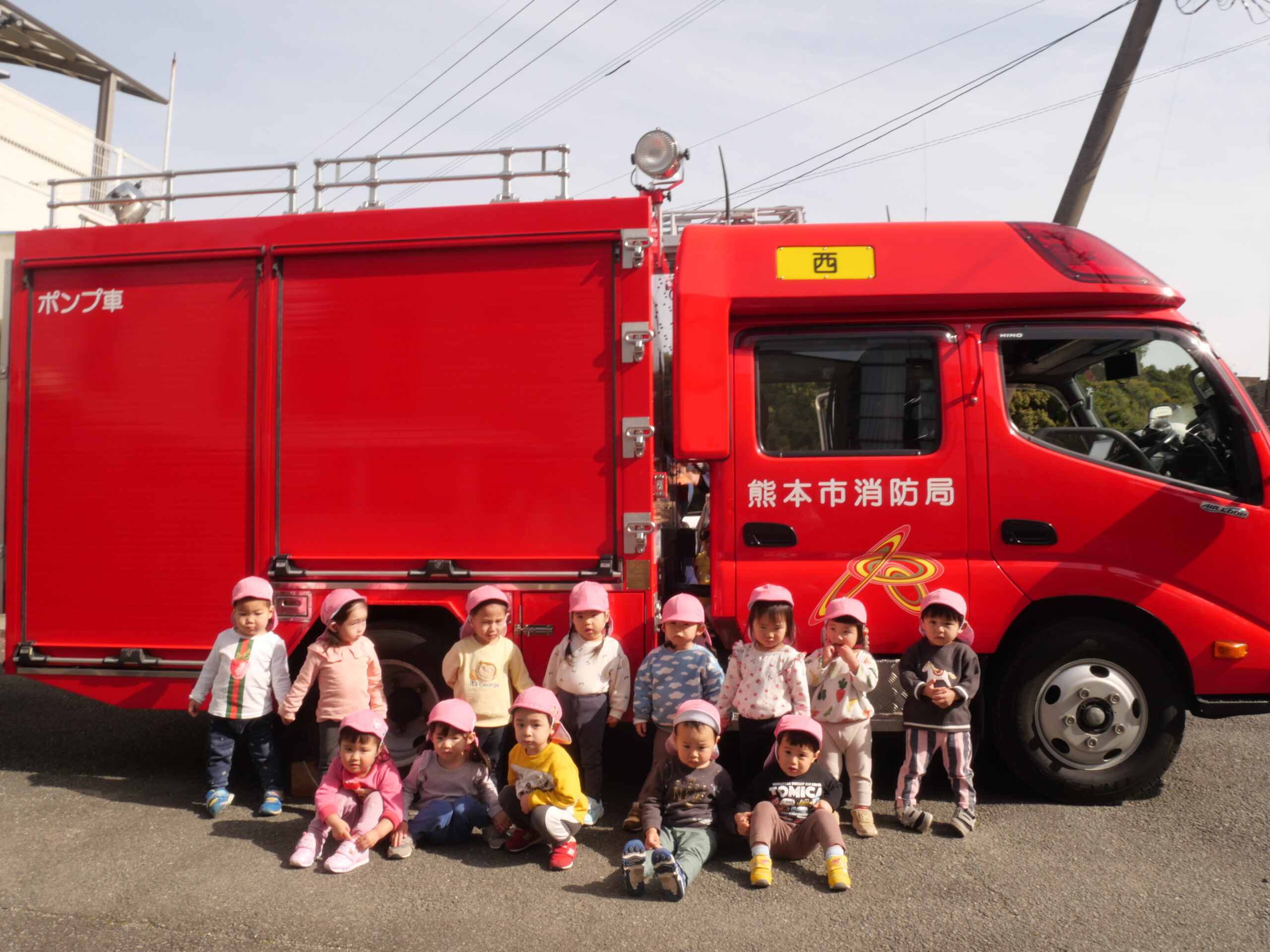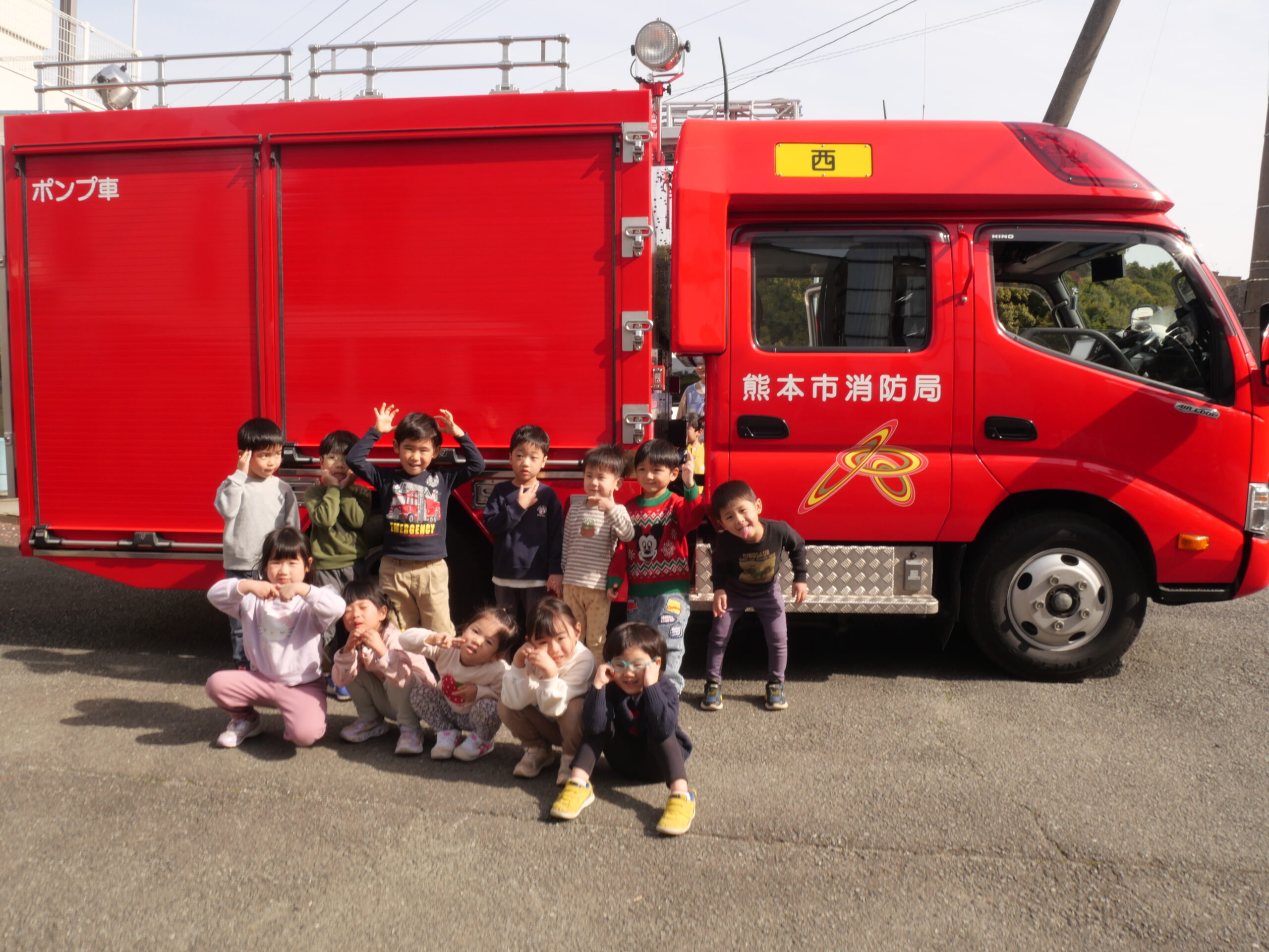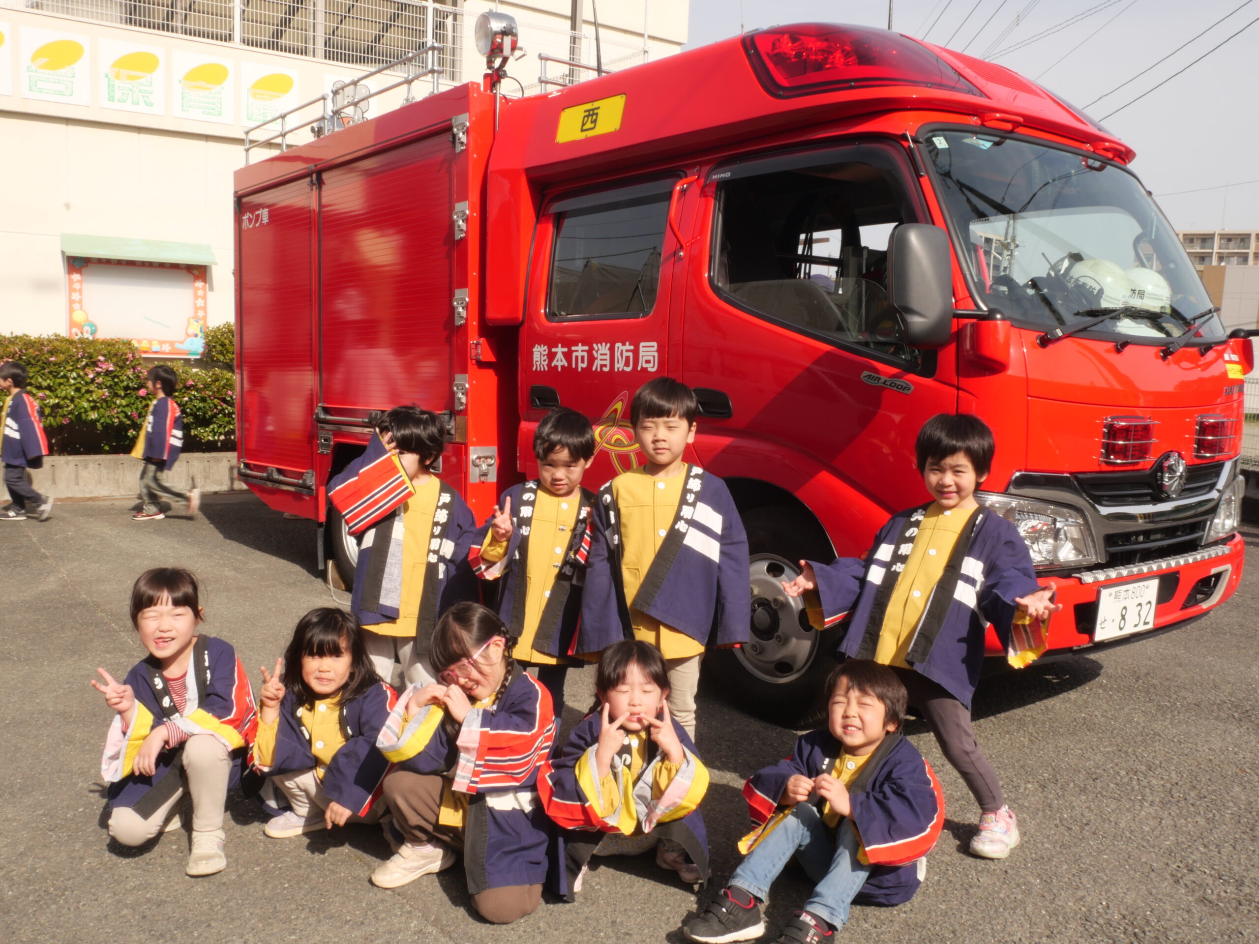 2026.03.06 🚑幼年消防修了式🚒 令和7年度の幼年消防修了式が行われました。 熊本市西消防署から隊員の皆さんをお迎えして、自然と背筋が伸びる子どもたち。堂々と「修了証」を受け取る姿がありました🌟 隊員さんと一緒にポンプ車を見学。かっこいい装備に興味津々の子どもたち。 記念撮影もばっちり📷 火遊びはしない、と誓った子どもたちでした💛