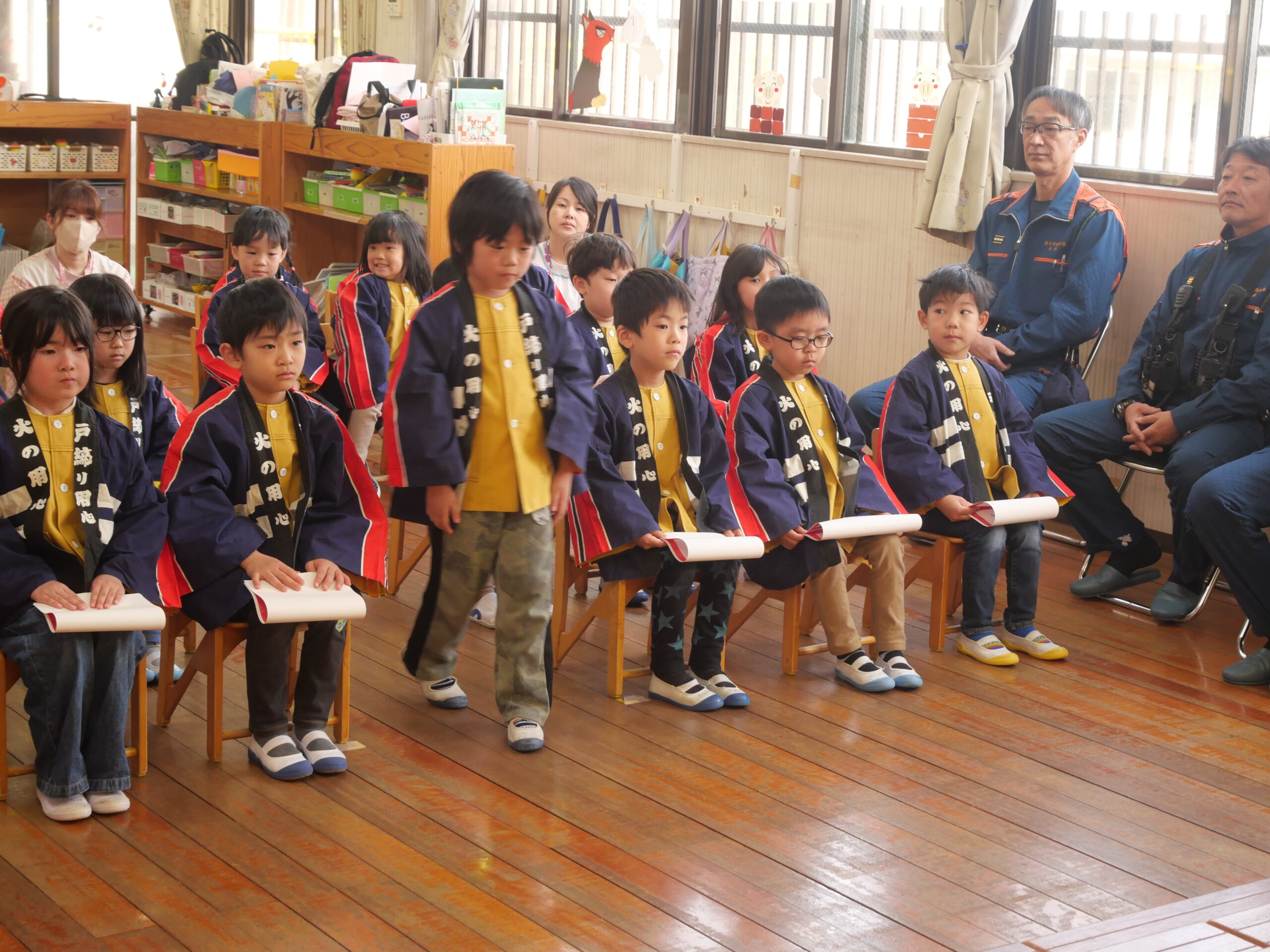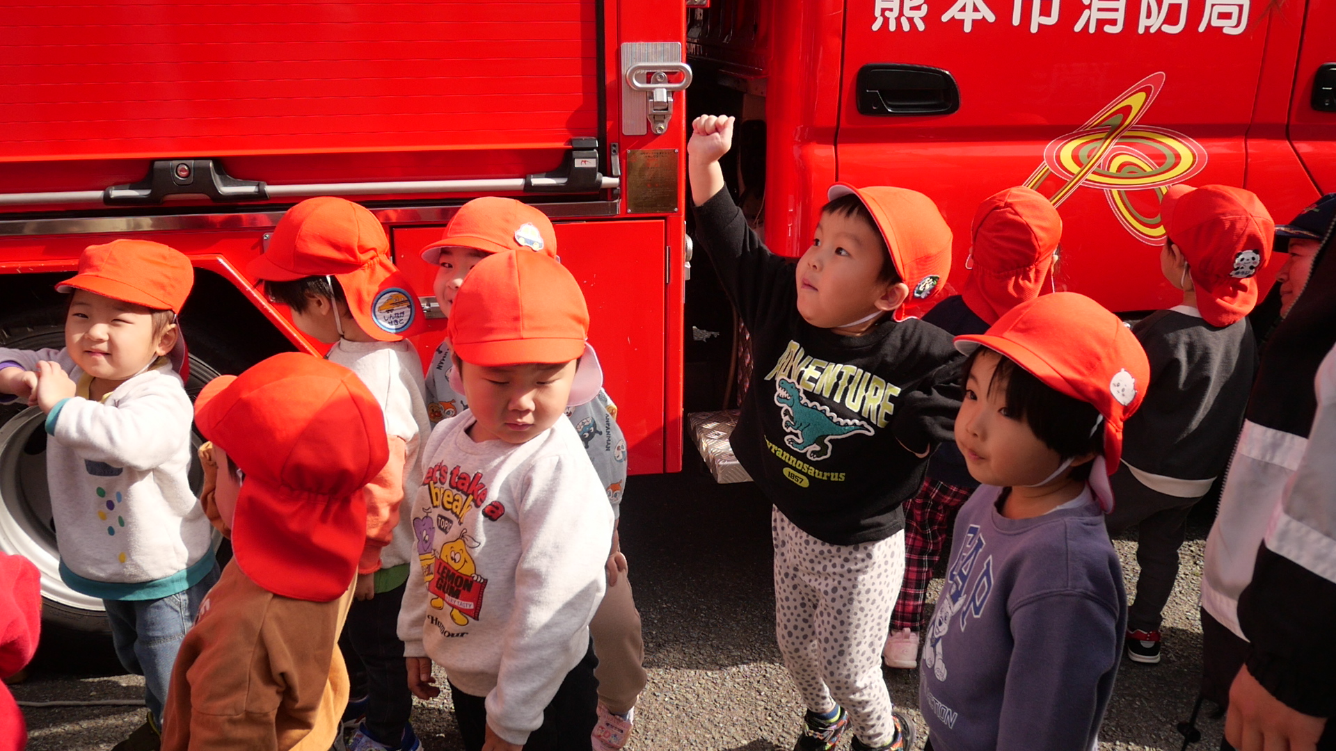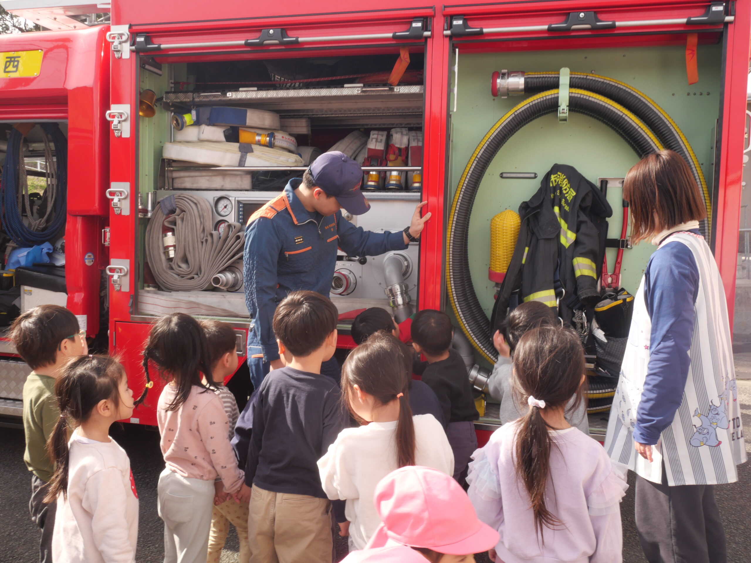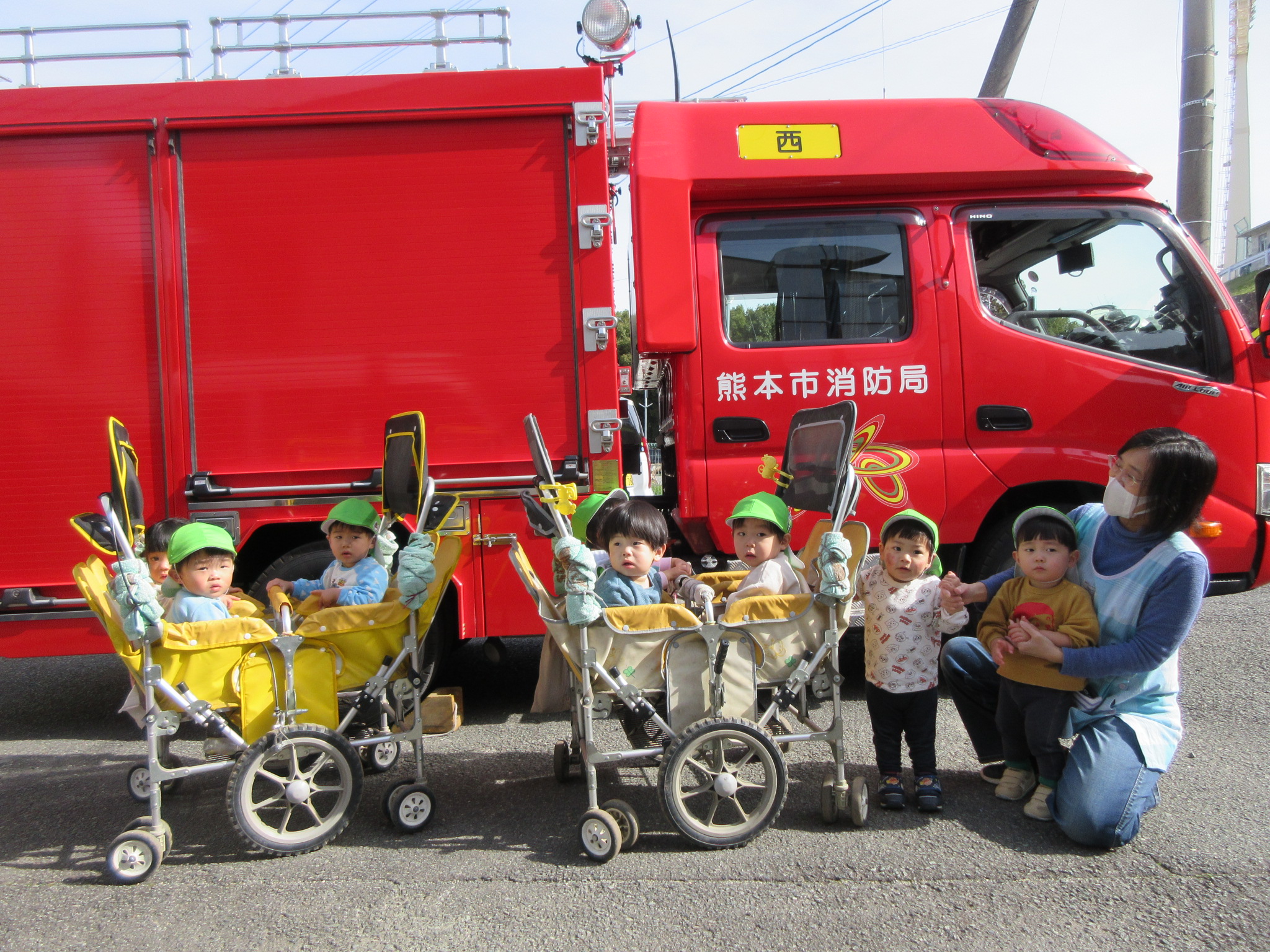 2026.03.06 🚑幼年消防修了式🚒 令和7年度の幼年消防修了式が行われました。 熊本市西消防署から隊員の皆さんをお迎えして、自然と背筋が伸びる子どもたち。堂々と「修了証」を受け取る姿がありました🌟 隊員さんと一緒にポンプ車を見学。かっこいい装備に興味津々の子どもたち。 記念撮影もばっちり📷 火遊びはしない、と誓った子どもたちでした💛