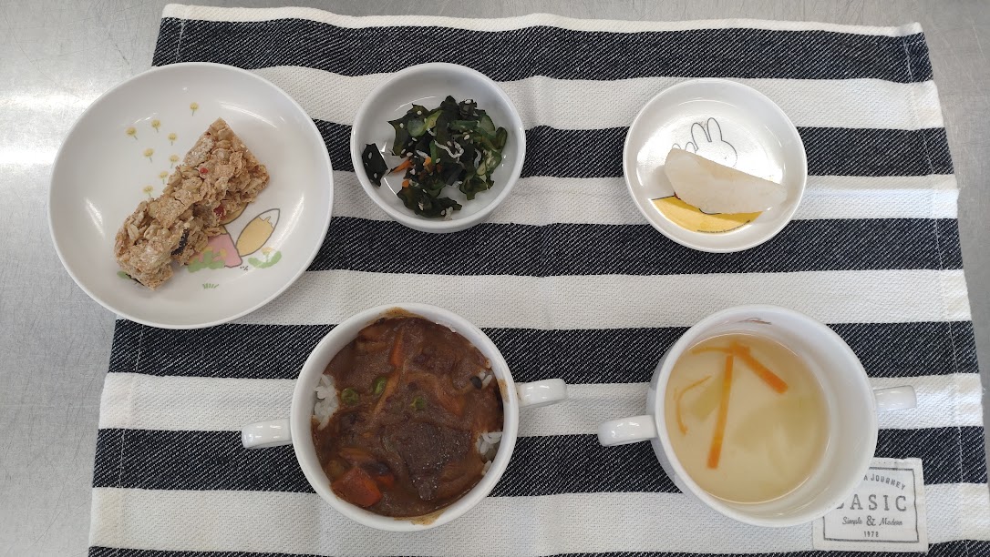 ・ハヤシシチュー・きゅうりとわかめの酢の物・梨
