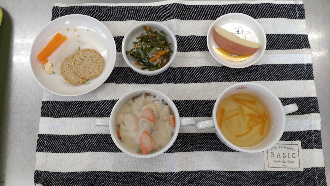 ・根菜シチュー ・茎わかめの酢の物 ・りんご