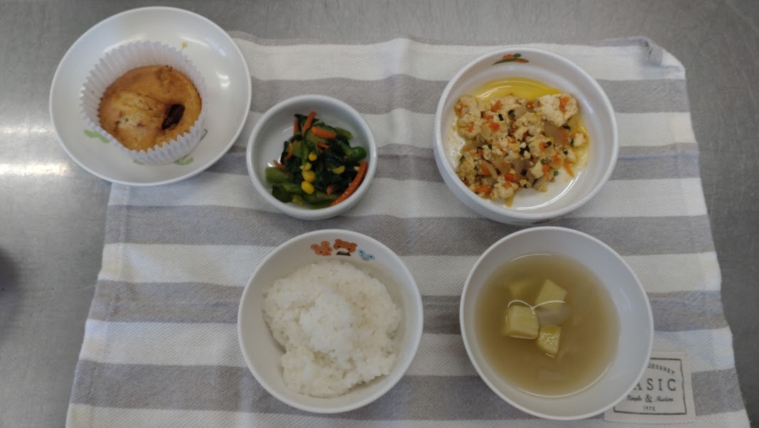 ・炒り豆腐 ・青菜とコーンのサラダ ・さつま芋味噌汁