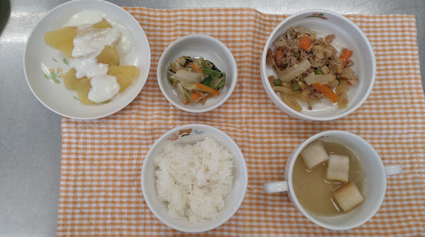 ・豚肉と大豆の煮もの ・なめたけ和え ・麩の味噌汁