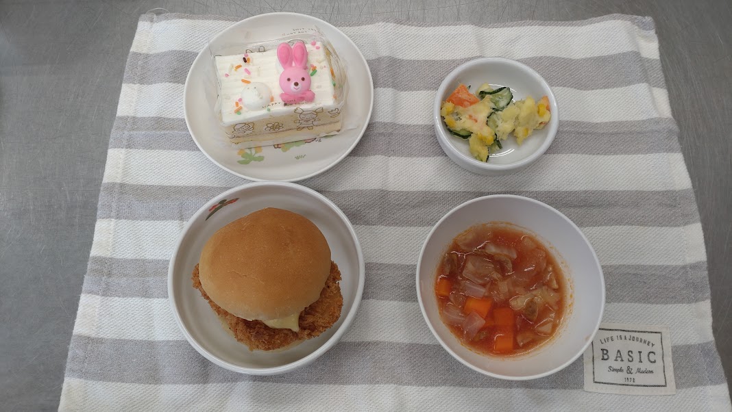 ・フィッシュバーガー ・さつまいもサラダ ・ミネストローネ