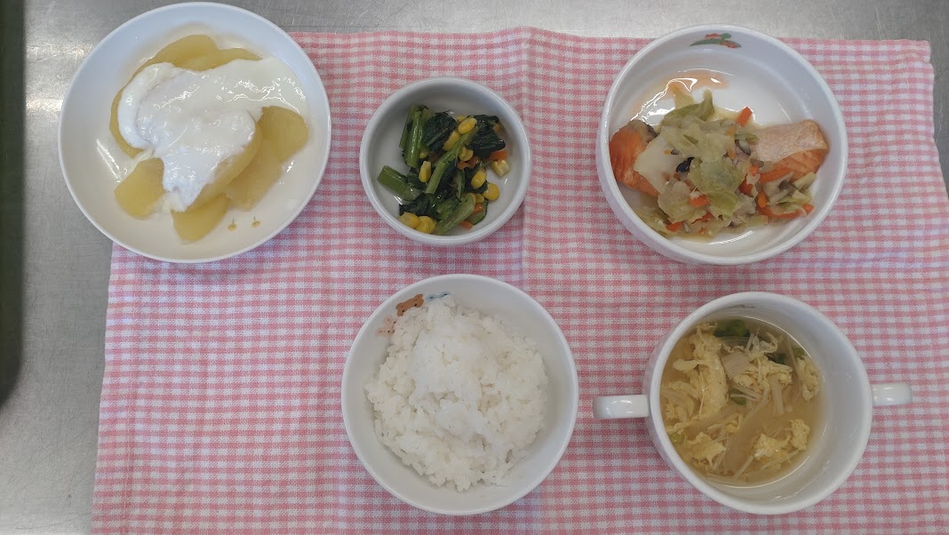 ・鮭のちゃんちゃん焼き ・青菜とコーンのサラダ ・かき玉汁