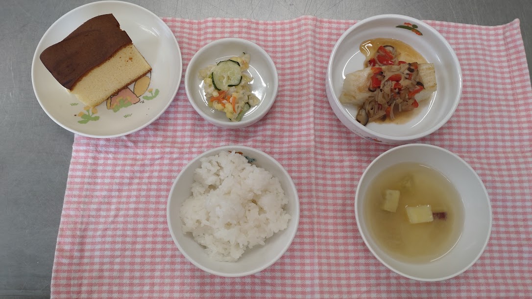 ・魚のきのこソース・カミカミサラダ・さつまいも味噌汁