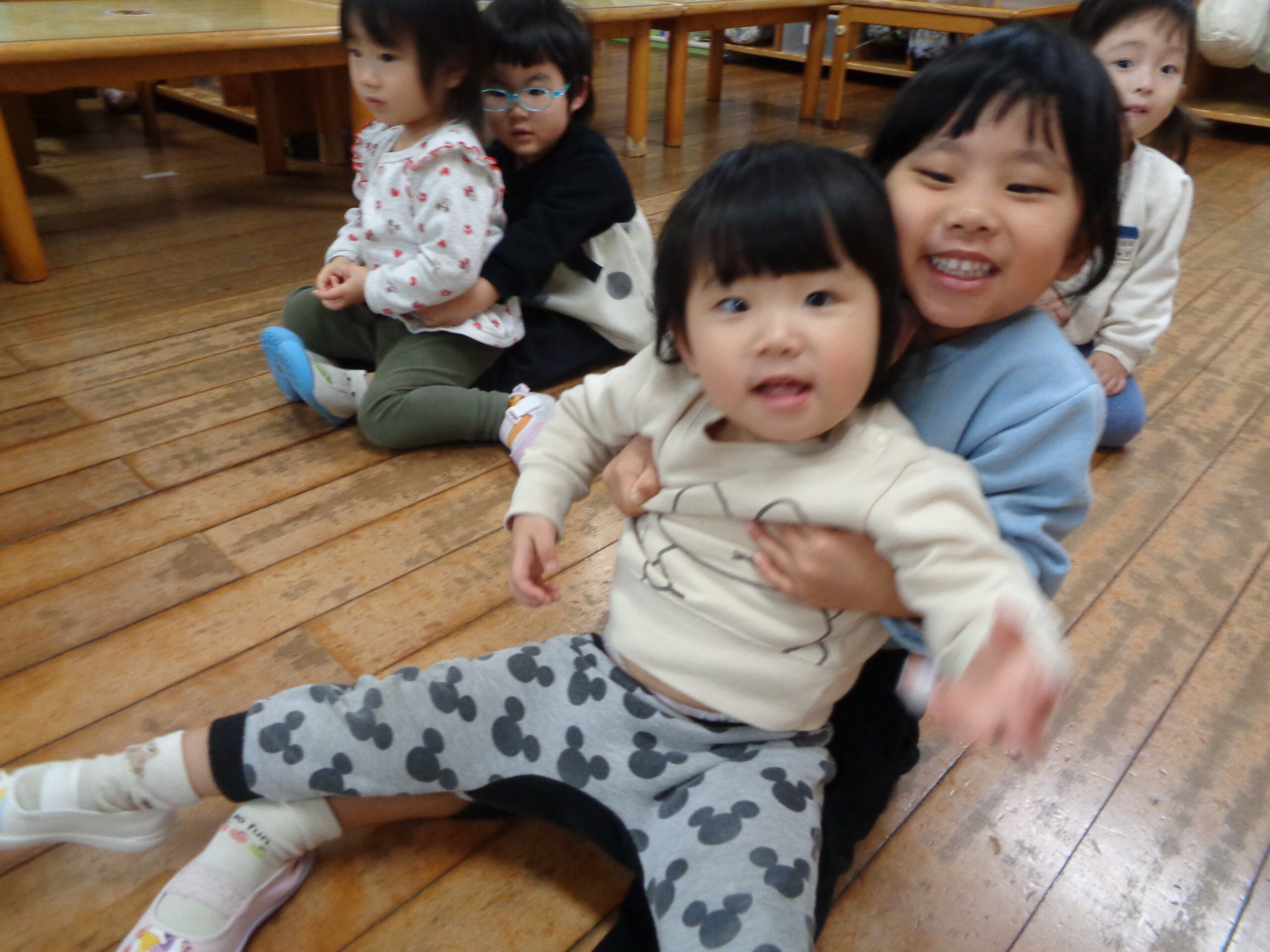 くま組さんがうさぎ組さんを抱っこしてくれて、触れ合い遊びをしました🎵音楽をかけて「バスに乗って」や「こちょこちょ電車」をやってみました。ちょっと緊張している様子もありましたが、次第に表情がほぐれていく子どもたち。