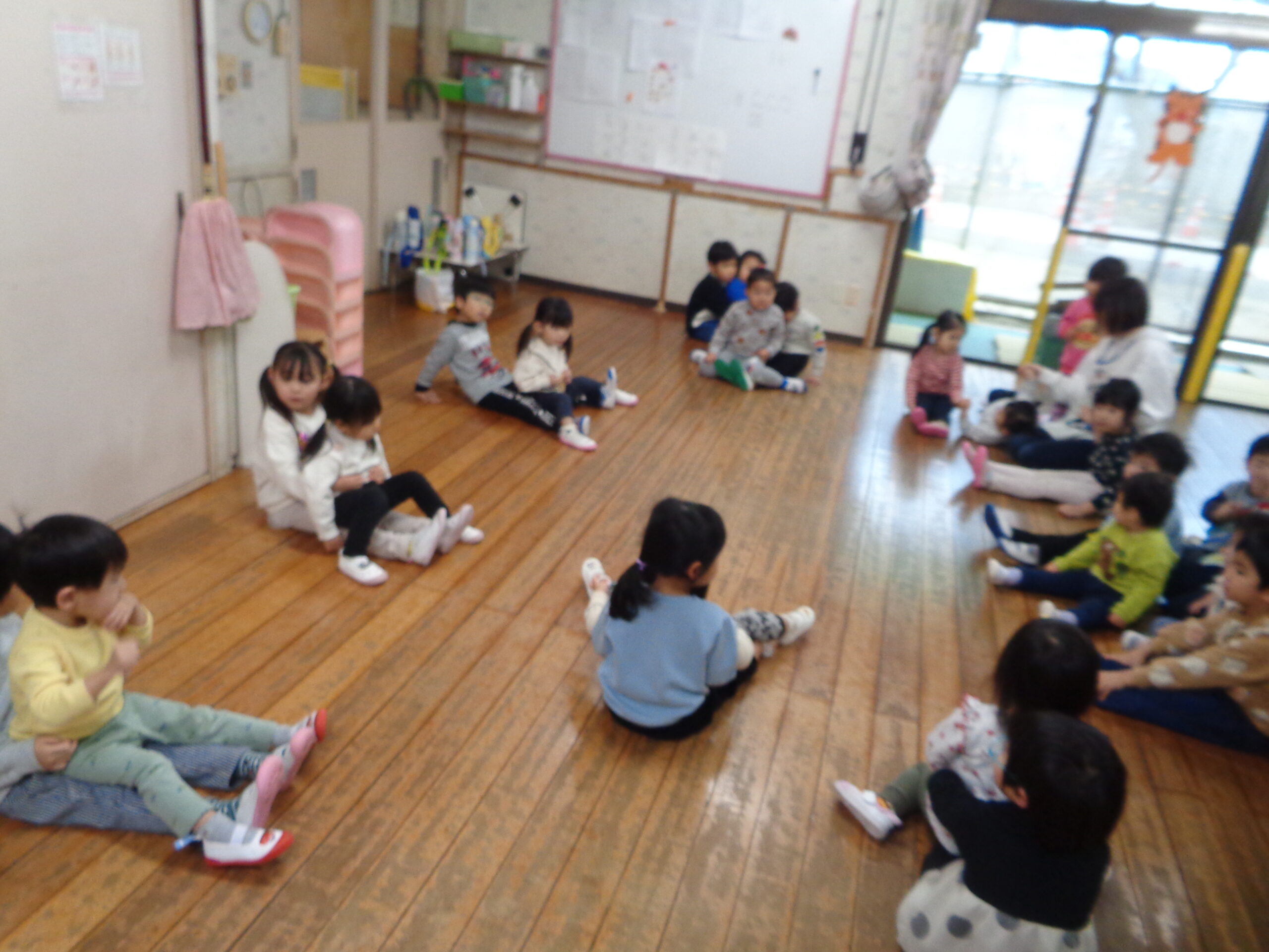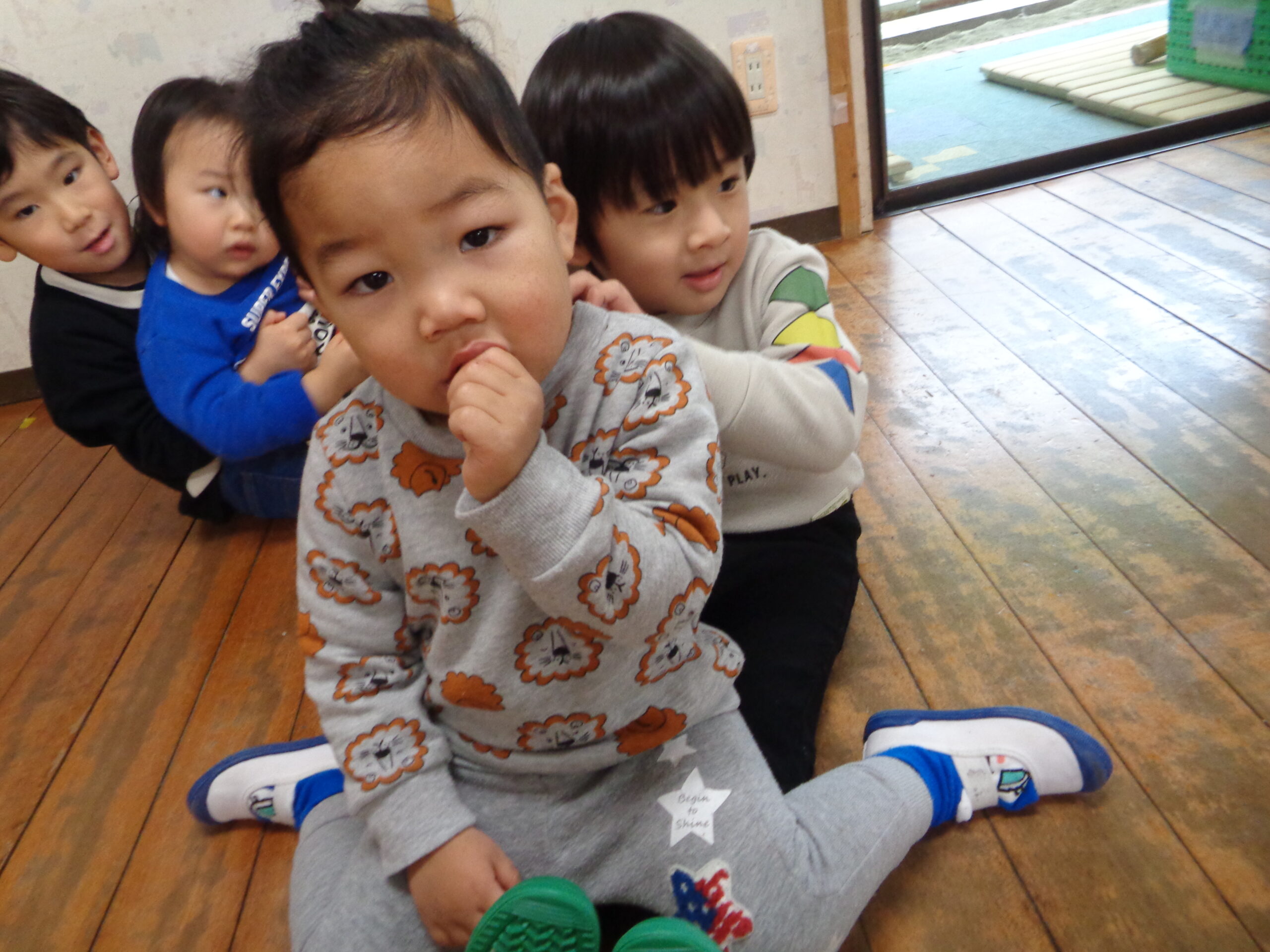 こちらは1,2歳児クラスの様子。「鬼のパンツ」「まめまき」の歌をみんなで楽しみました。