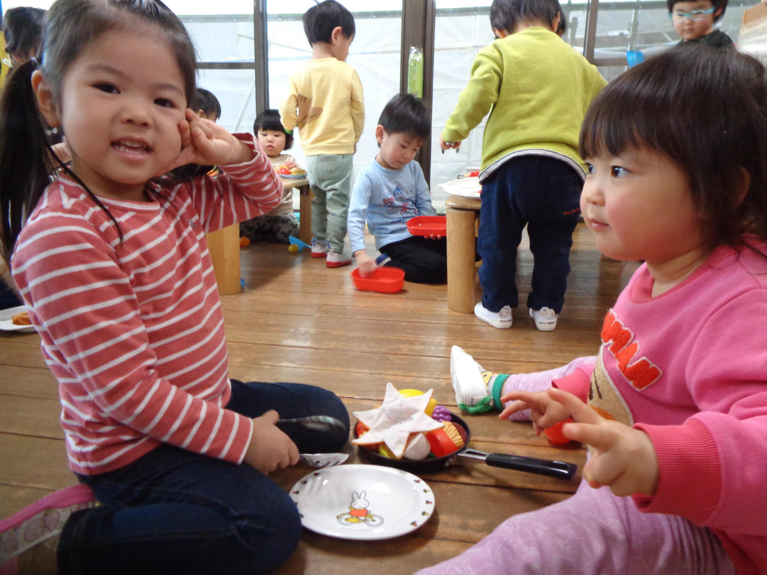 ままごと遊びもしました!「いらっしゃいませ~」「お皿はこっちで洗って」など、3歳児さんらしく、ままごと遊びを展開していくのを見て、うさぎ組さんも真似してみる姿も🌱