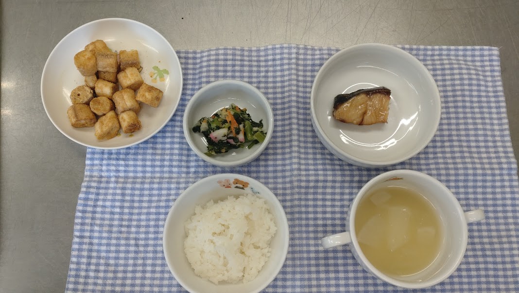 ・豚肉と大豆の煮もの ・なめたけ和え ・麩の味噌汁