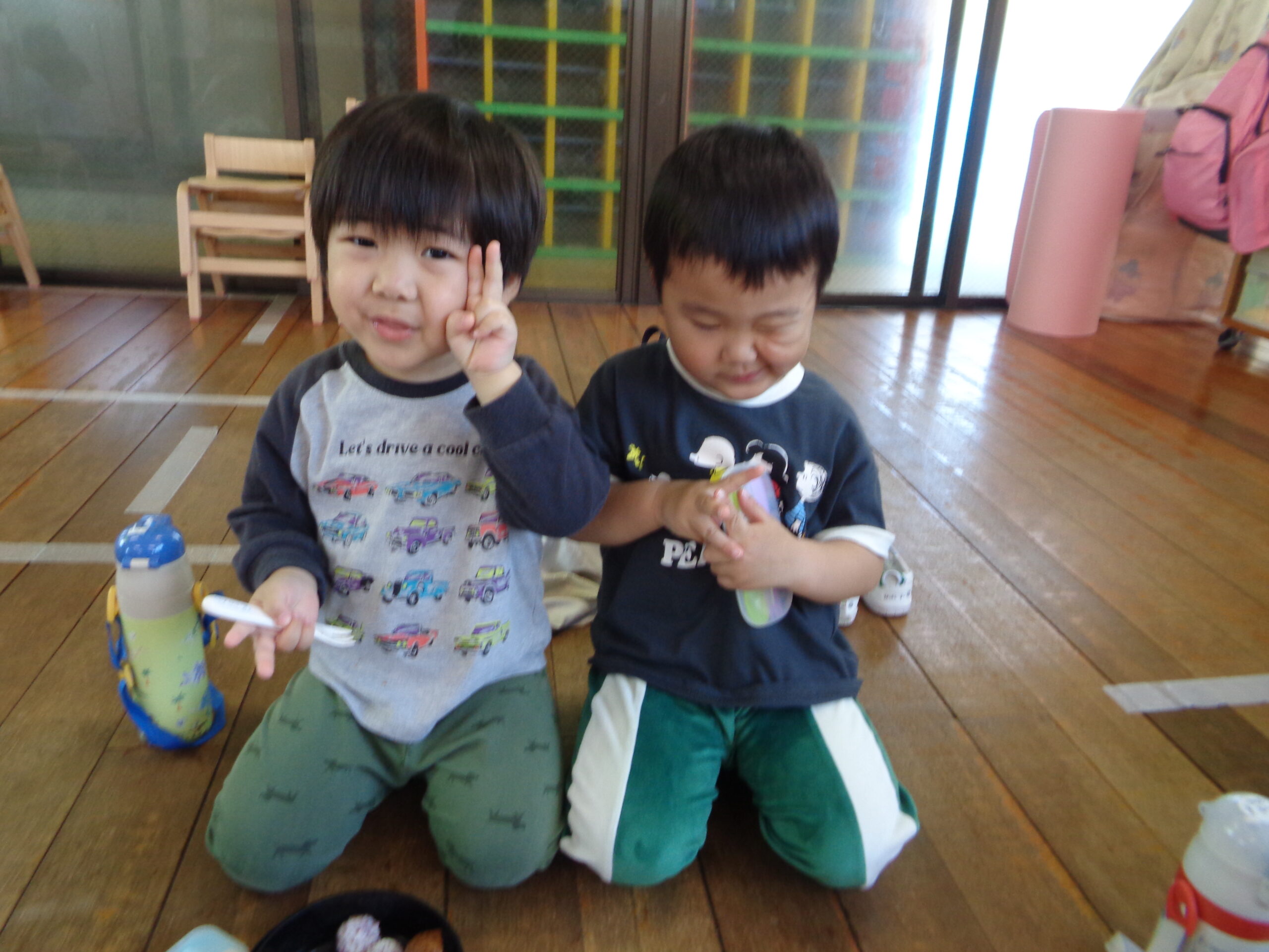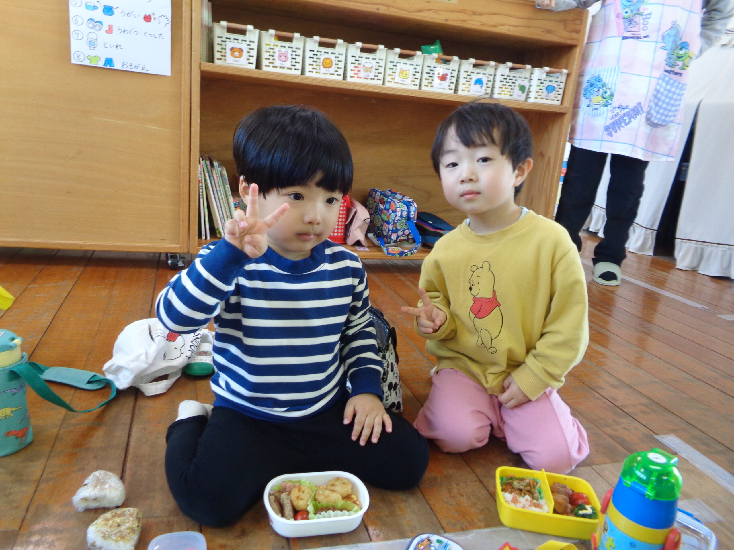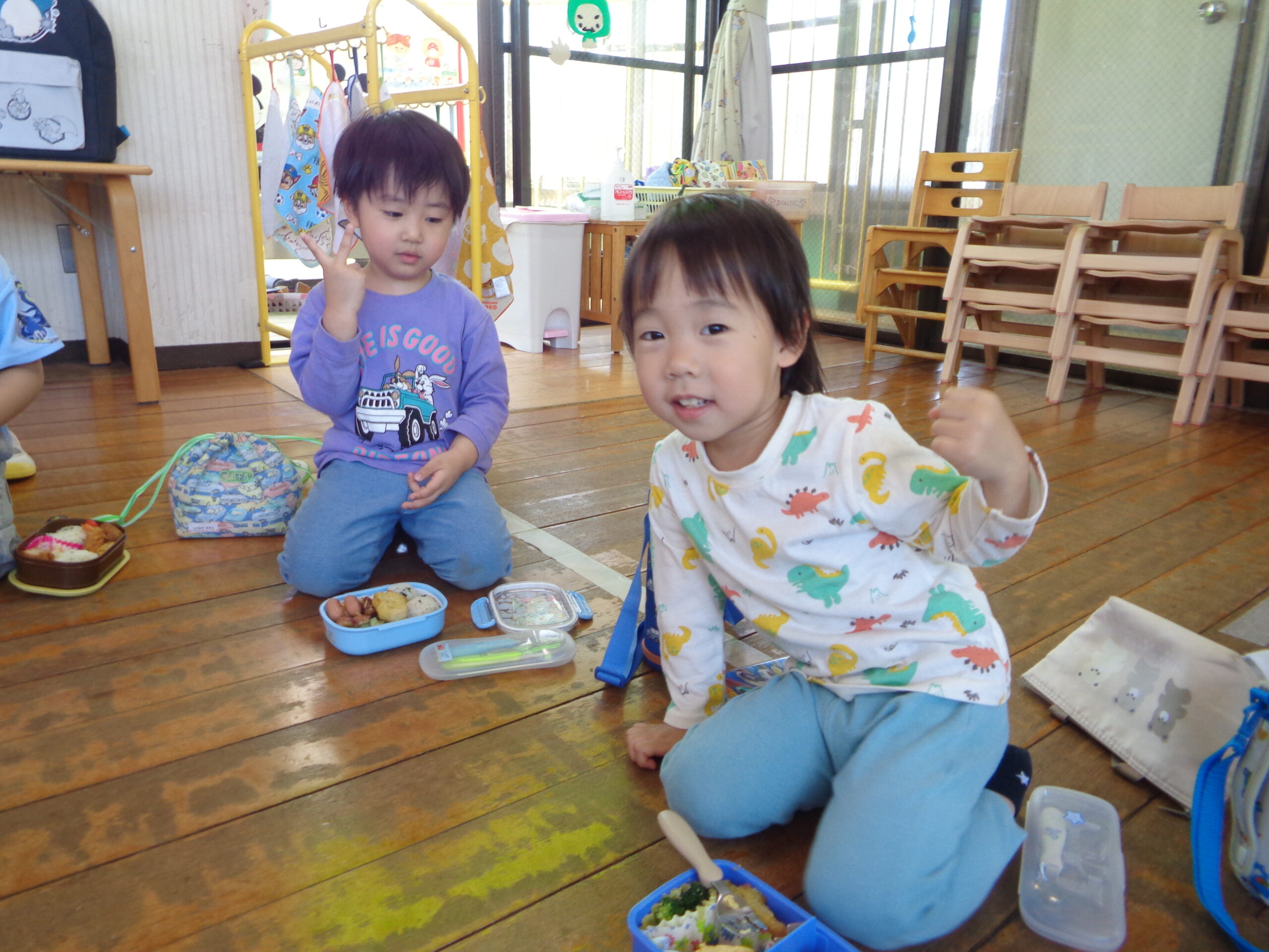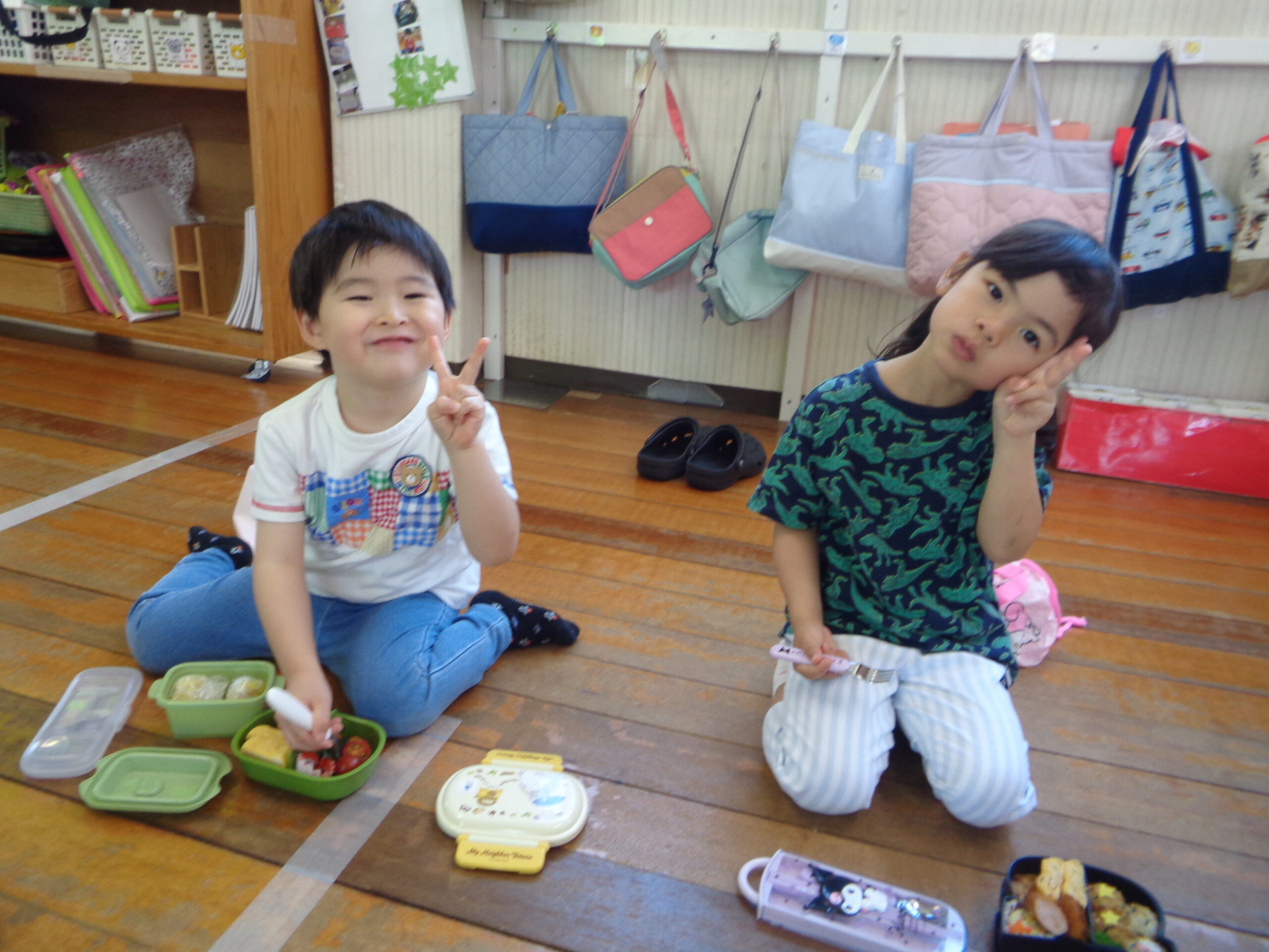 おうちの方からの愛情たっぷり弁当をお友だちと食べて嬉しそうですね😊